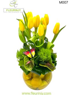 THE ZESTY LEMON VASE 10 TULIPS 4 ANTHURIUMS 3 SWEET WILLIAMS GREENS SIZE: 43 X 26 CM