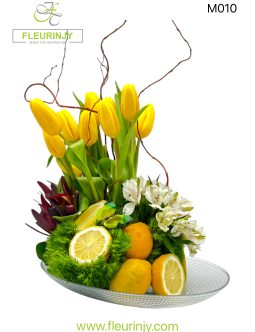 THE LEMON OVAL PLATE 10 TULIPS 3 ALSTROEMERIAS 3 SAFARI 3 SWEET WILLIAMS GREENS FRESH LEMONS
