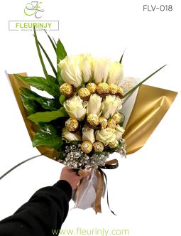 Hand Bouquet : 15 white roses 16 rocher pieces greens wrapped in white and gold
