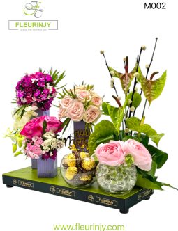 2,900 EGPRECTANGULAR BLACK BOX: 12 purple roses 6 pink baby orchids green baby breath green pot 8 pieces rocher