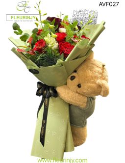 THE TEDDY BOUQUET INCLUDING TEDDY BEAR HOLDING A HAND TIED BOUQUETÂ 8 ROSES 3 ORCHIDS 3 ANTHURIUMS 3 CALLA 2 RANCHULAS GREENS AND FILLERS WRAPPED IN OUR UNIQUE WRAPPING