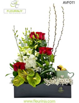 OUR SIGNATURE RECTANGULAR BLACK ACRYLIC BOX MUG INSIDE IT 5 PIECES CHOCOLATE ROCHER 12 RED ROSESÂ 4 BABY ORCHIDS 3 ANTHURIUMSÂ 3 SALIX COTTON