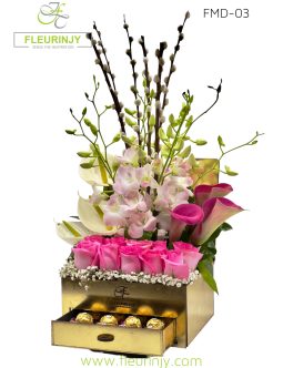 OUR SIGNATURE DRAWER BOX: 7 white baby orchids 3 pink baby orchids 3 purple anthuriums 6 pink roses 3 calla pink 16 pieces rocher SIZE: 45 X 20CM