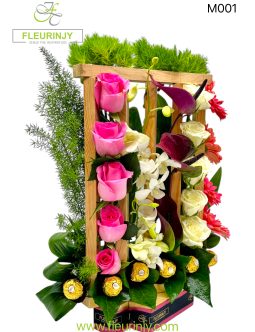 WOODEN FRAME DESIGN INCLUDING: 3 ANTHURIUMS 4 SWEET William 10 ROSES 4 GERBERA GREENS 6 PIECES ROCHER CHOCOLATE SIZE: 35 X 50 CM