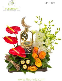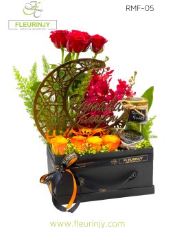 Black rectangular box 5 red roses 4 orange roses 4 red orchid Greens Ramadan kareem stand 1 mixed nuts jar 1 dried fruits SIZE: 30 X 40 CM