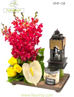 Wooden pallet 5 orange roses 3 red anthuriums 5 white orchids 3 rocher 1 Lighting lantern 1 dried fruits SIZE : 30 X 30 CM