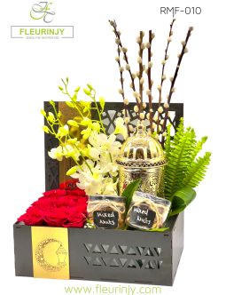 Flat Box: 1 Tamreya made of opaque stainless steel 3 Roses 2 Anthurium 3 Gerbera Inside the Tamreya: Quarter kilo of Premium Mejdool Dates From Timar, Stuffed with: -Caramalized Almonds – Pistachio oriental flavor – walnut Caramel – Halawamania – Hazelnut Croquant Chocolate Dates