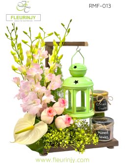 Wooden pallet 6 pink orchids 3 pink roses 1 white anthurium Green baby breath 1 mint green lantern 1 mixed nuts jar 1 dried fruits jar SIZE : 35 X 30 CM