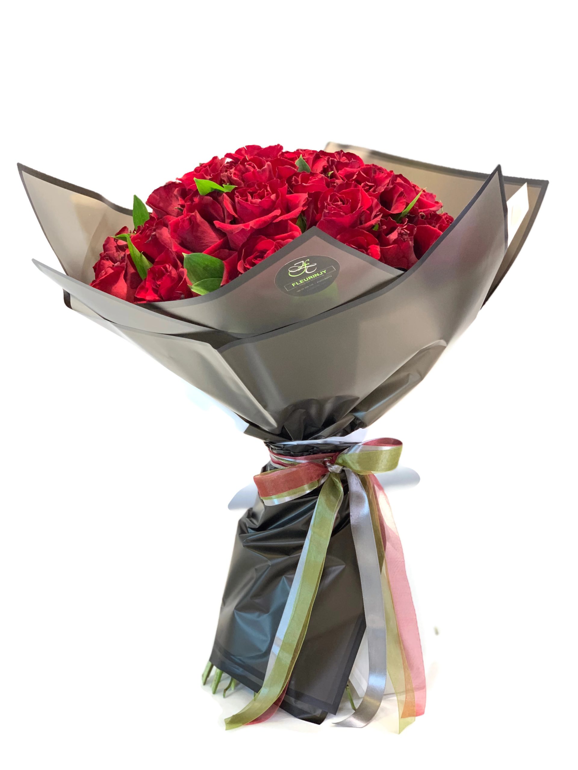 Description Hand Bouquet 50 Red Roses 60 Cm Wrapped in a slik Opaque Black Material Origin Of Roses: Kenya