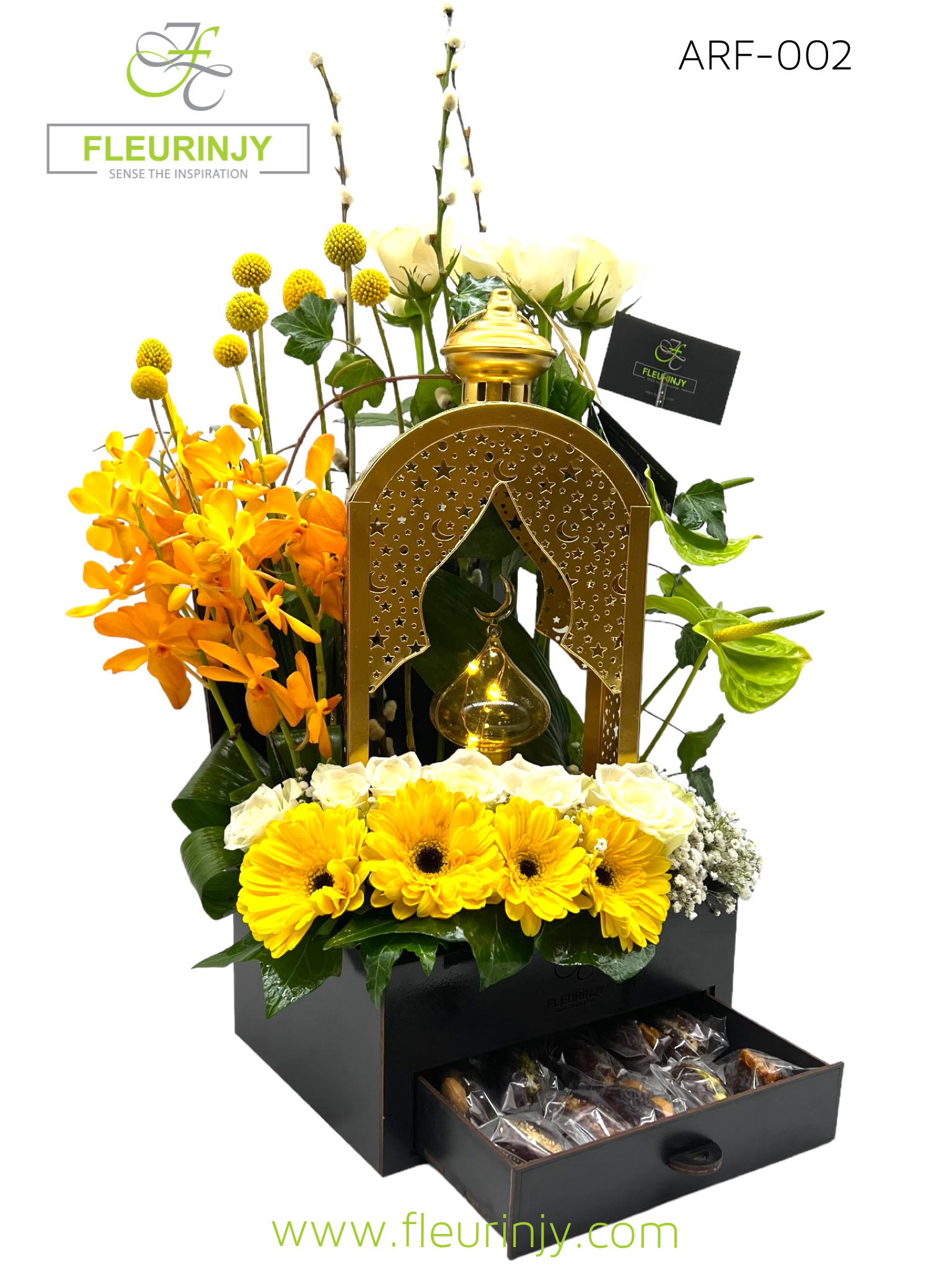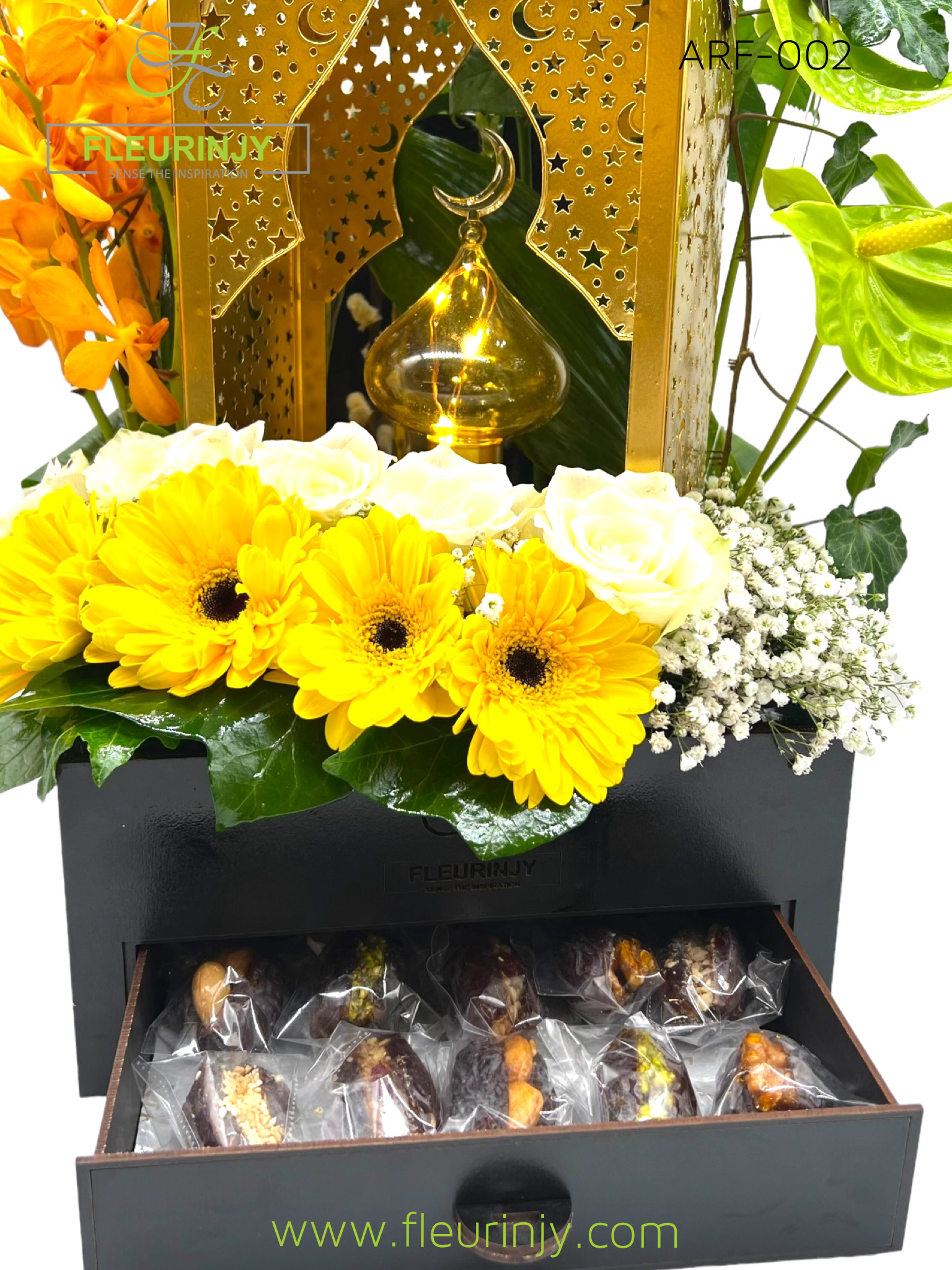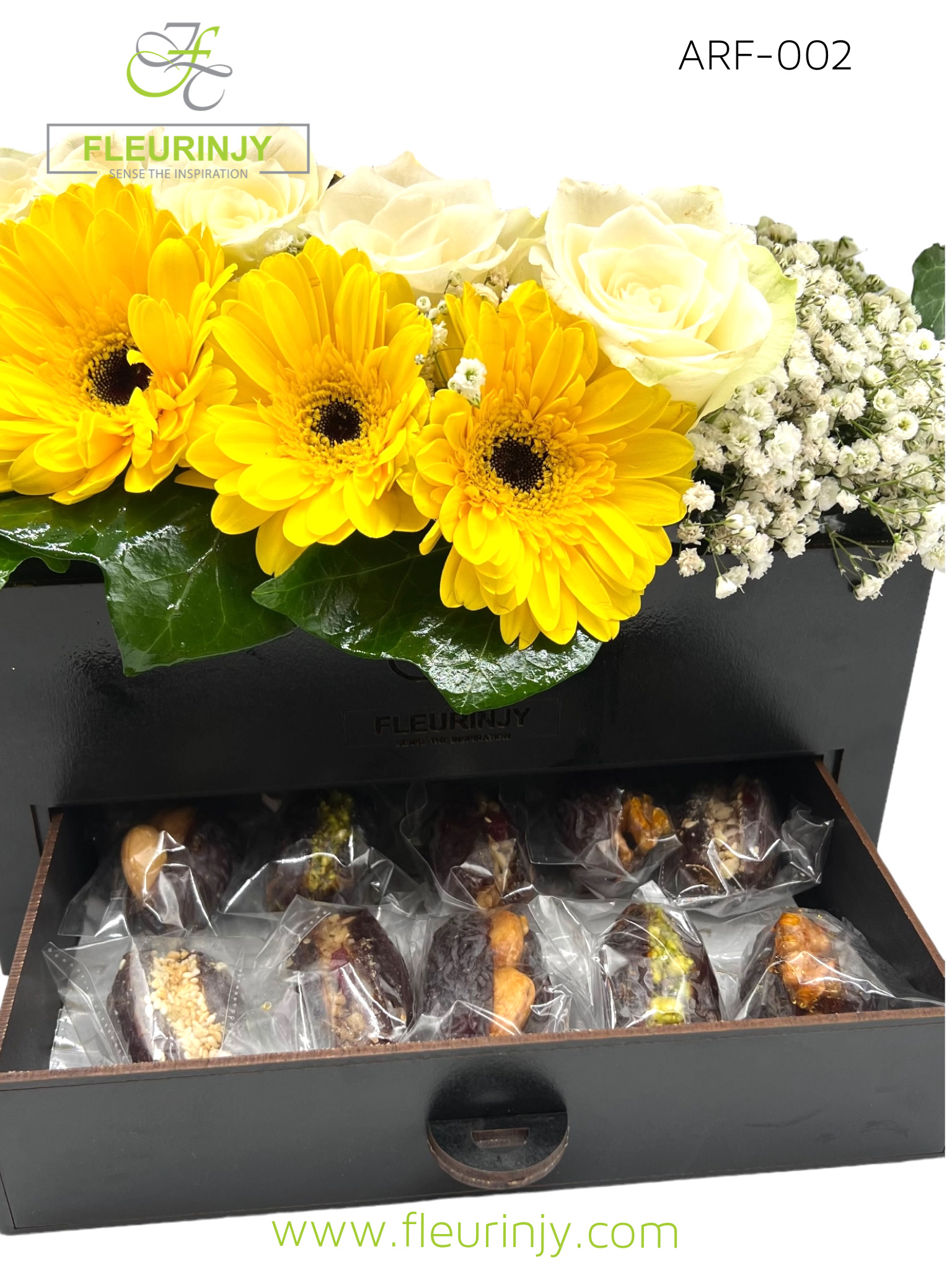 OUR DRAWER SIGNATURE BOX: 1 Stainless steel fanous 13 Roses 3 Salix cotton 4 Baby Orchids INSIDE DRAWER: Quarter kilo of Premium Mejdool Dates Stuffed with: -Caramalized Almonds – Pistachio oriental flavor – walnut Caramel – Halawamania – Hazelnut Croquant Chocolate Dates