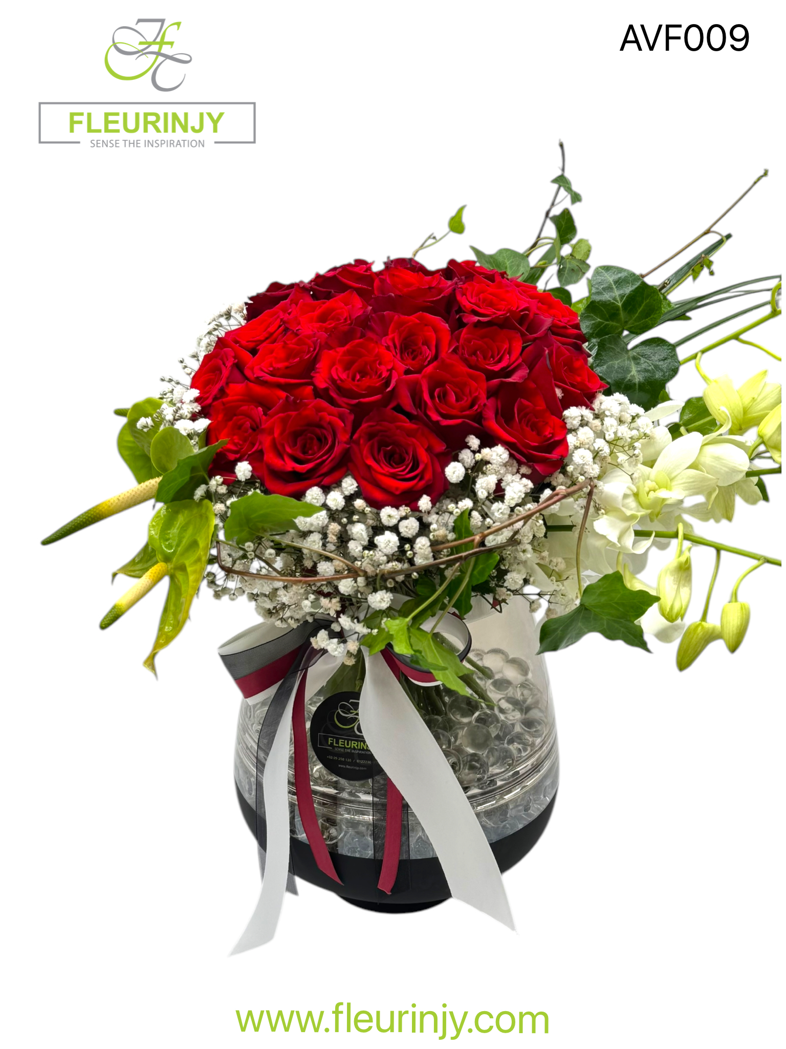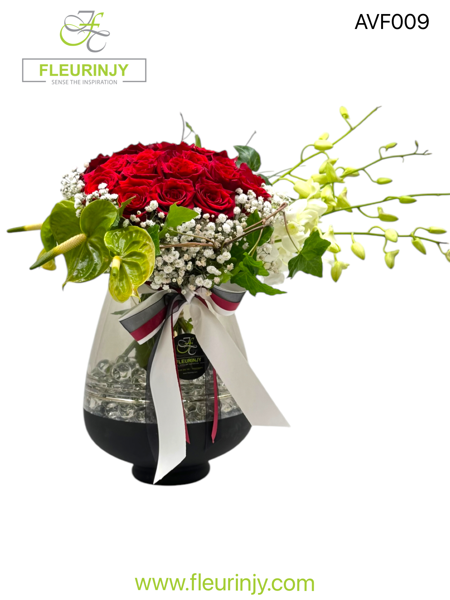 IMPORTED VASE 24 red roses 3 anthurium 5 baby orchids baby breath greens