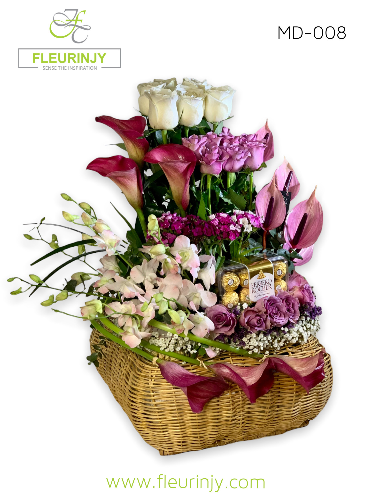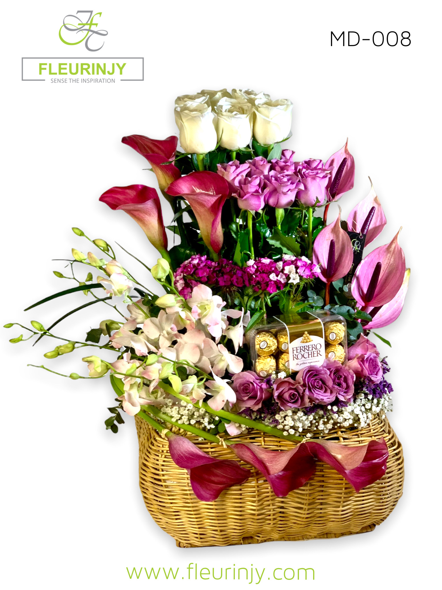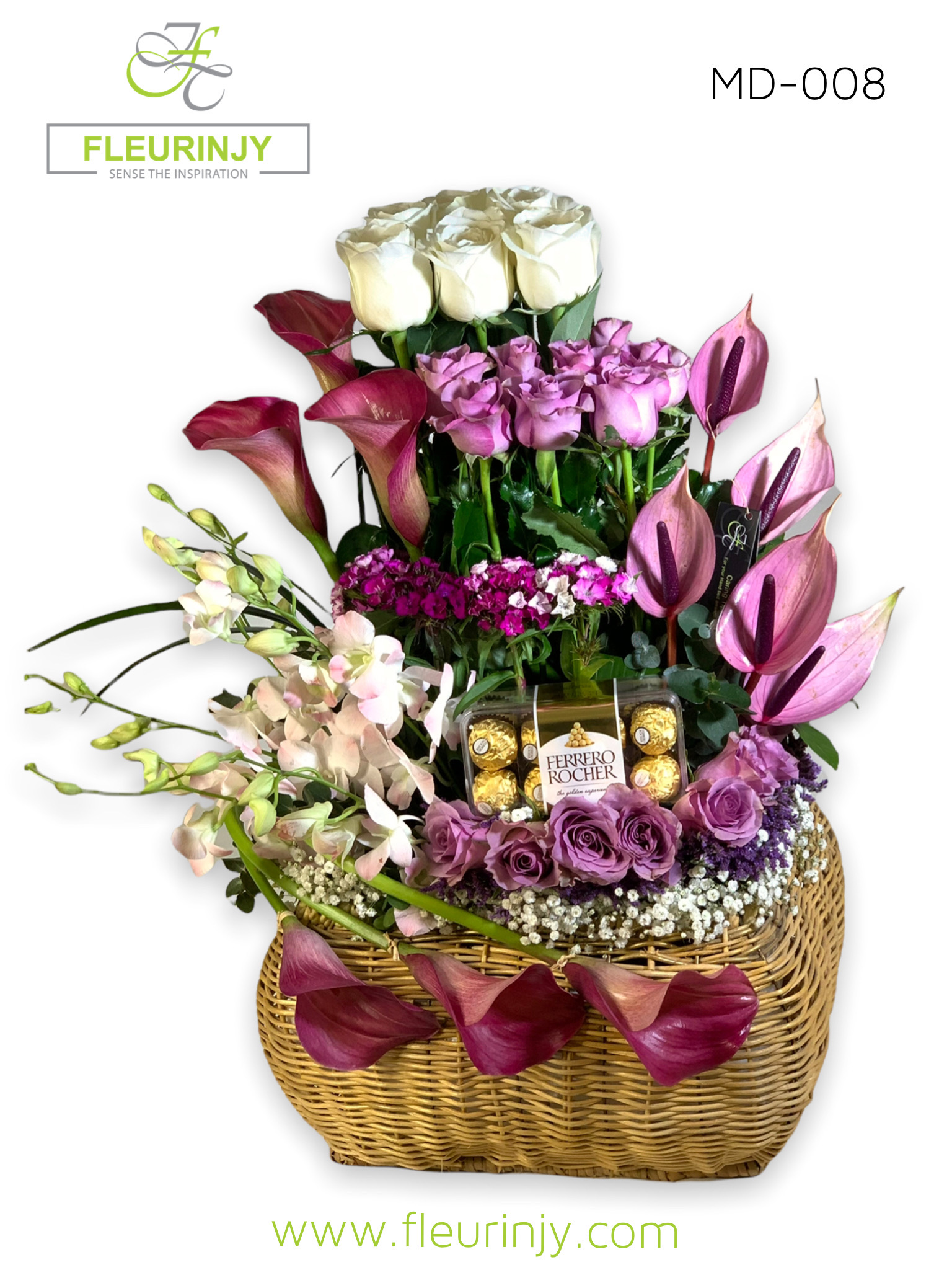 Square woven basket inside it: 6 white roses. 16 lilac roses 6 pink calla. 5 anthuriums . 6 baby orchid. 5 sweet william. 1 box of rocher ( 16 pieces ). Size: 40 x 60 cm.