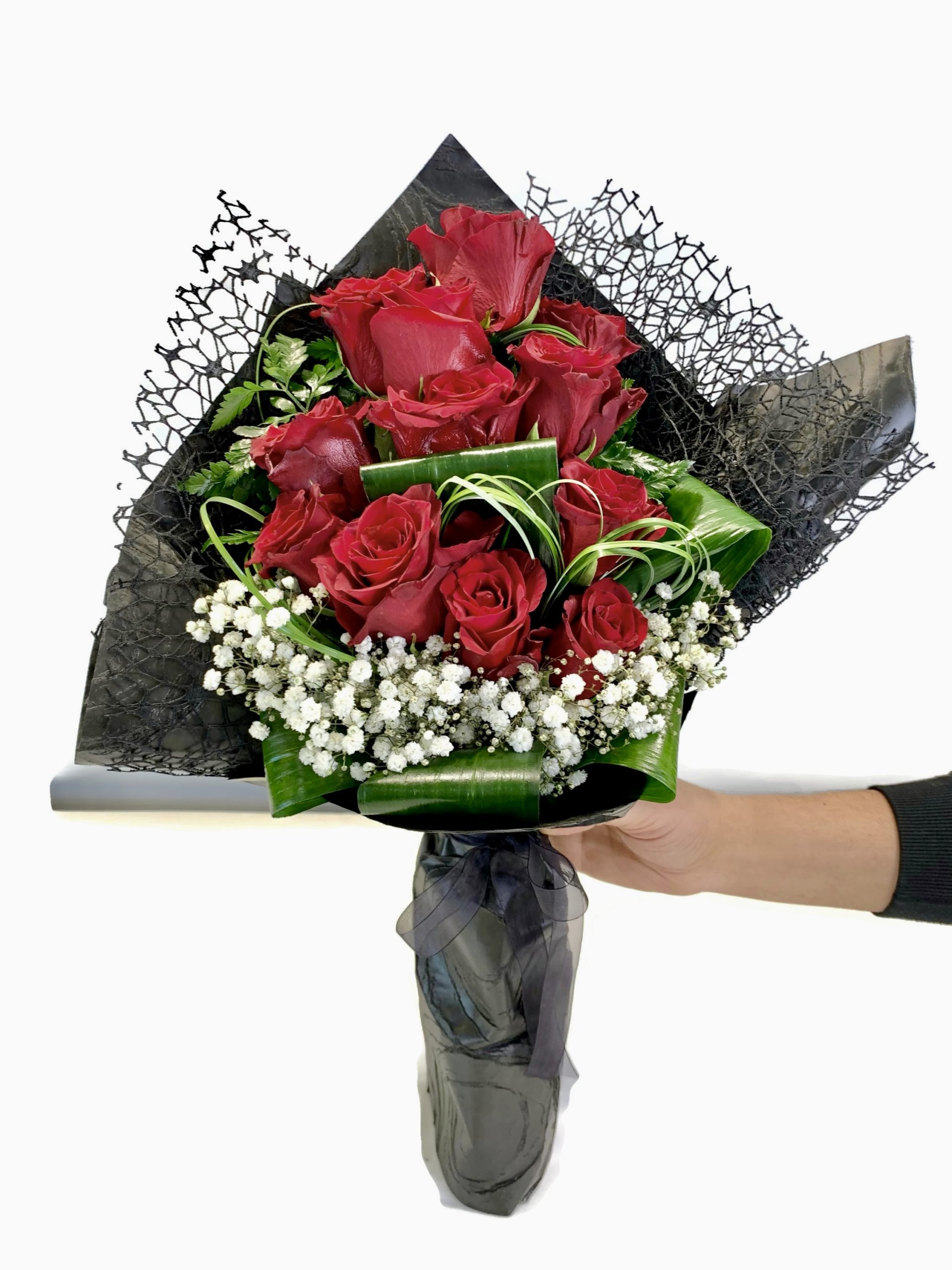 DESCRIPTION Hand Tied Bouquet Wrapped In Our Special Paper. 12 Red Roses, Baby Breath & Greenary. Length: 60 Cm