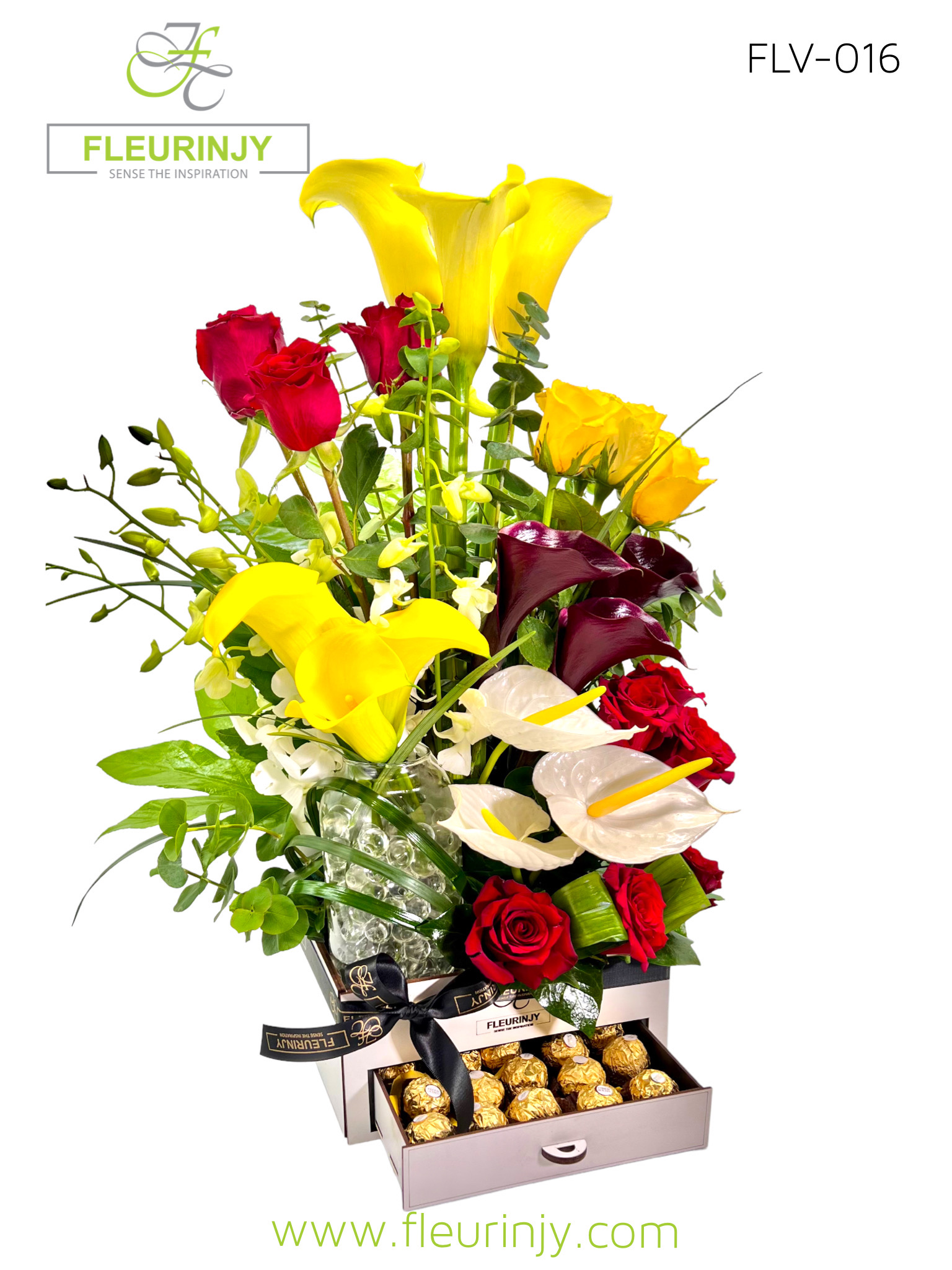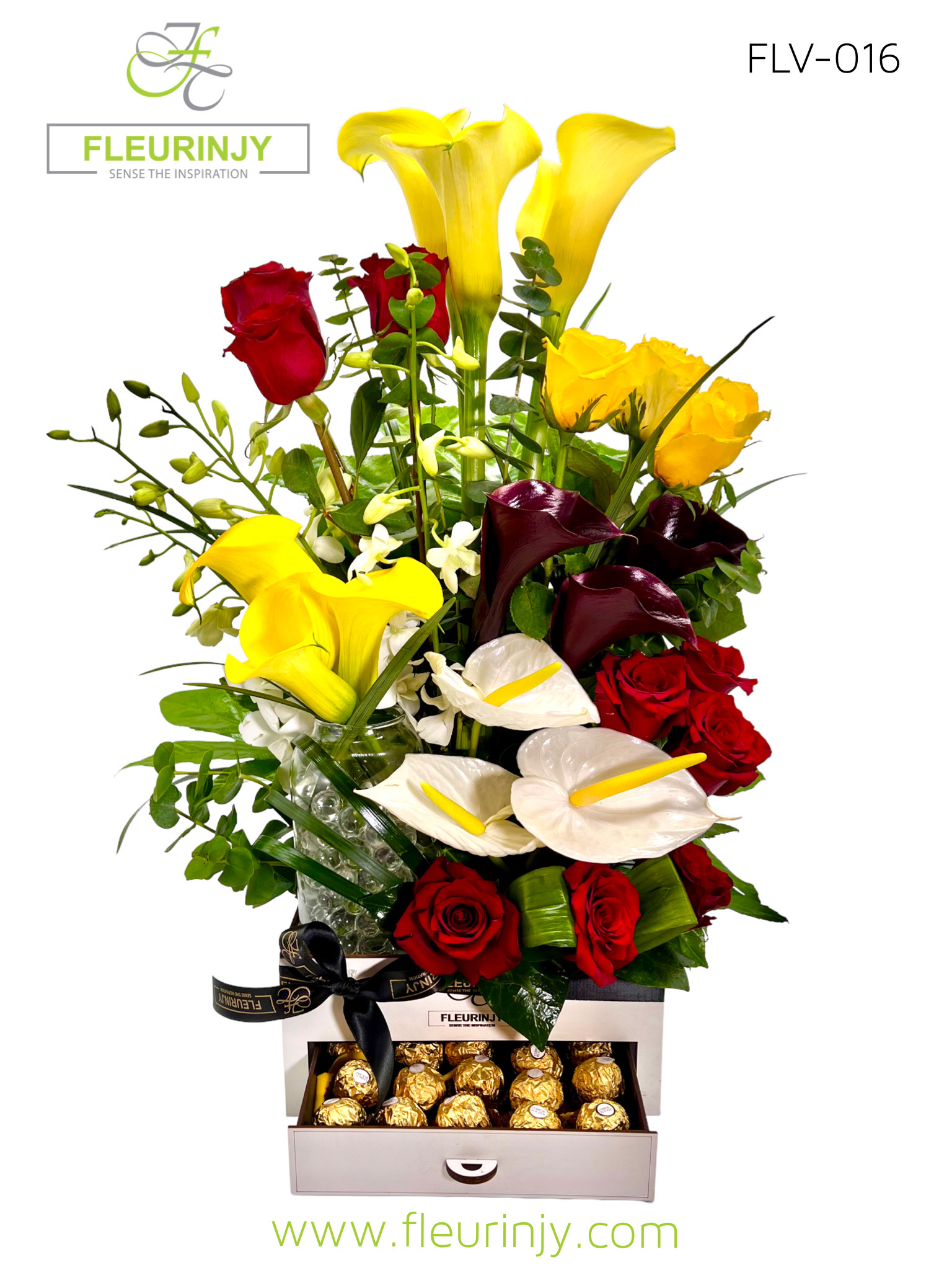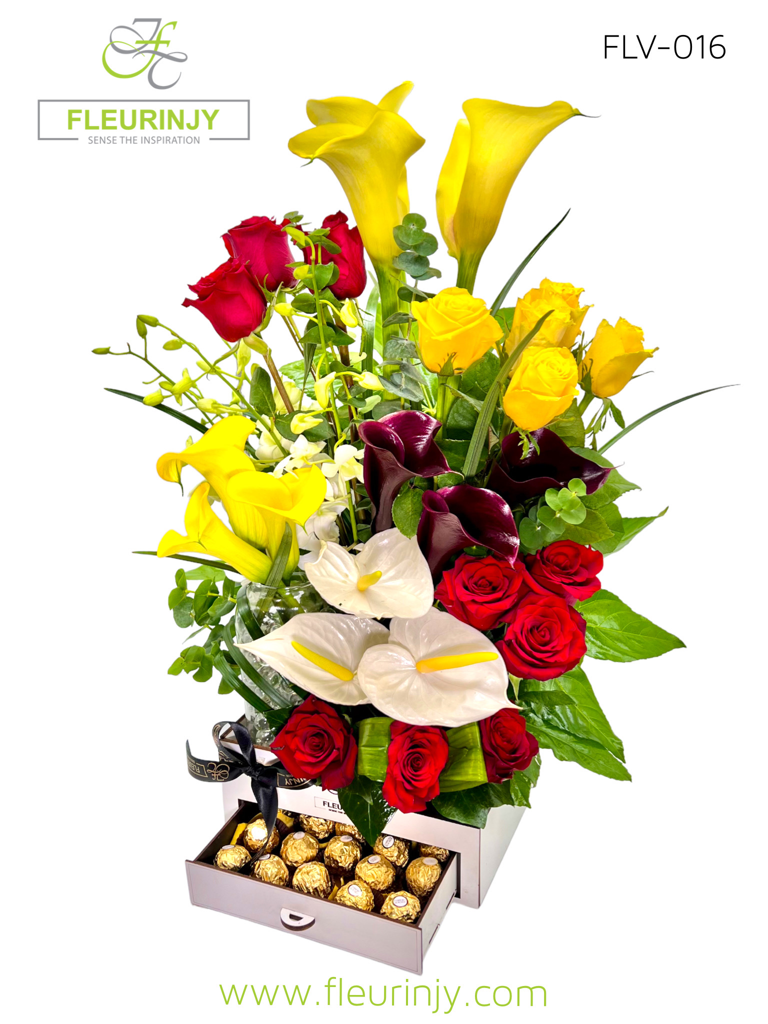 Our Signature drawer white box in it: 6 yellow callas 3 black callas 9 red roses 5 yellow roses 3 white anthuriums 5 white baby orchids 16 rocher pieces Size: 60 x 25