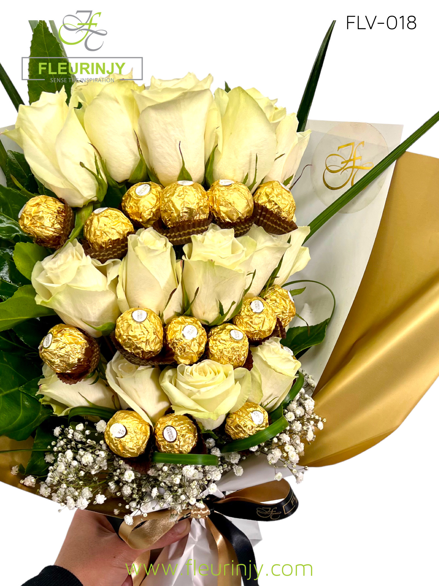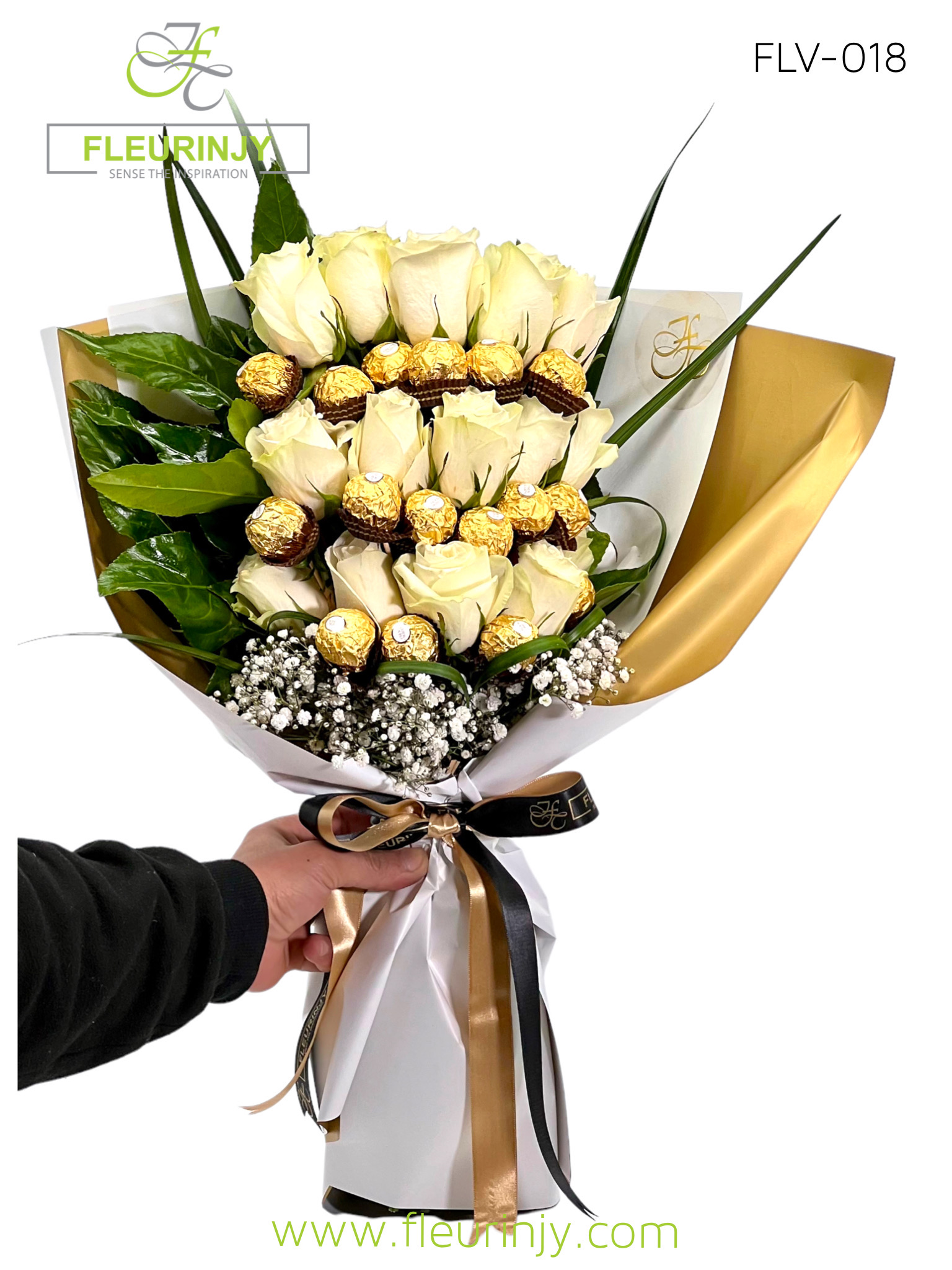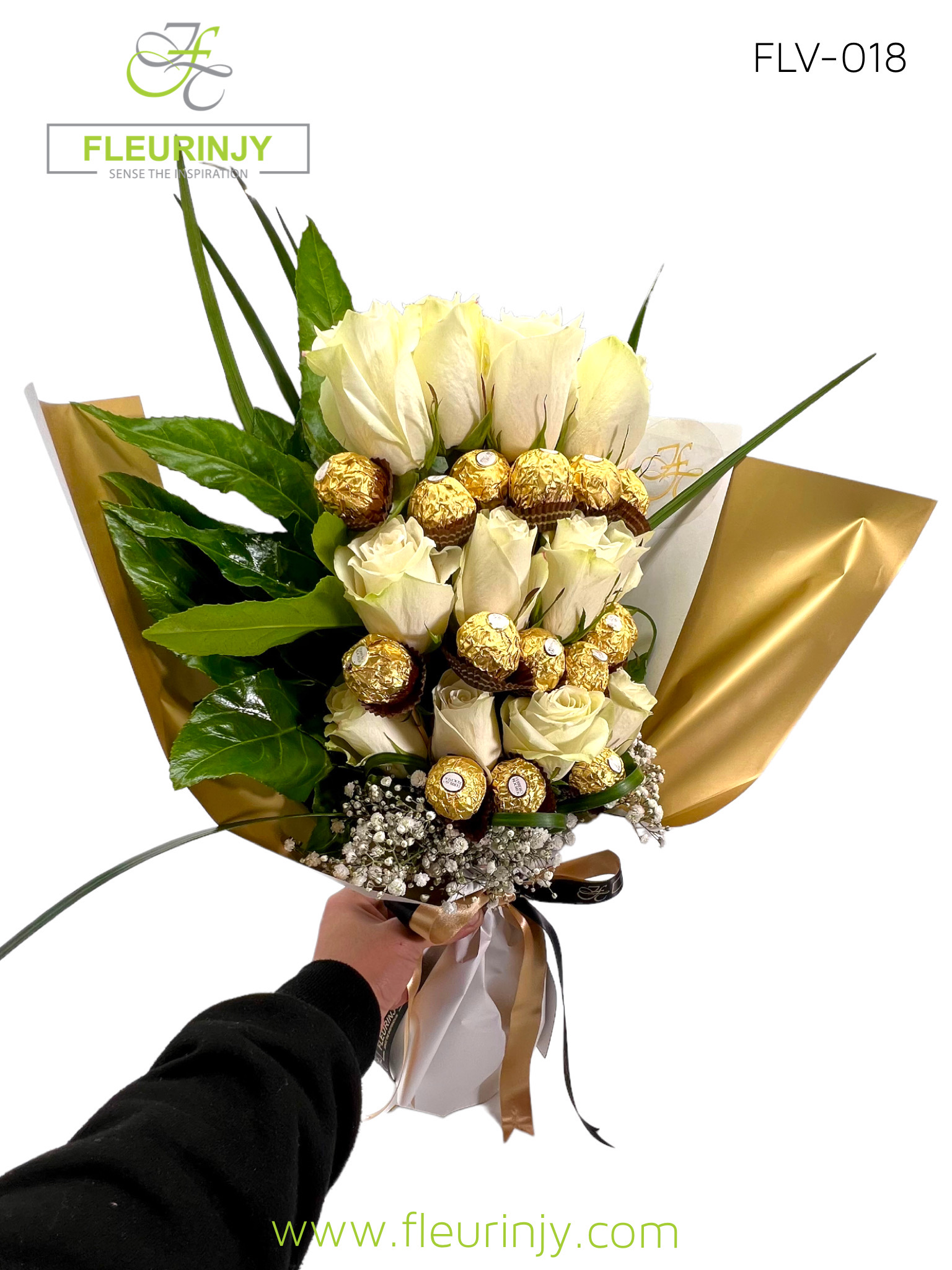 Hand Bouquet : 15 white roses 16 rocher pieces greens wrapped in white and gold