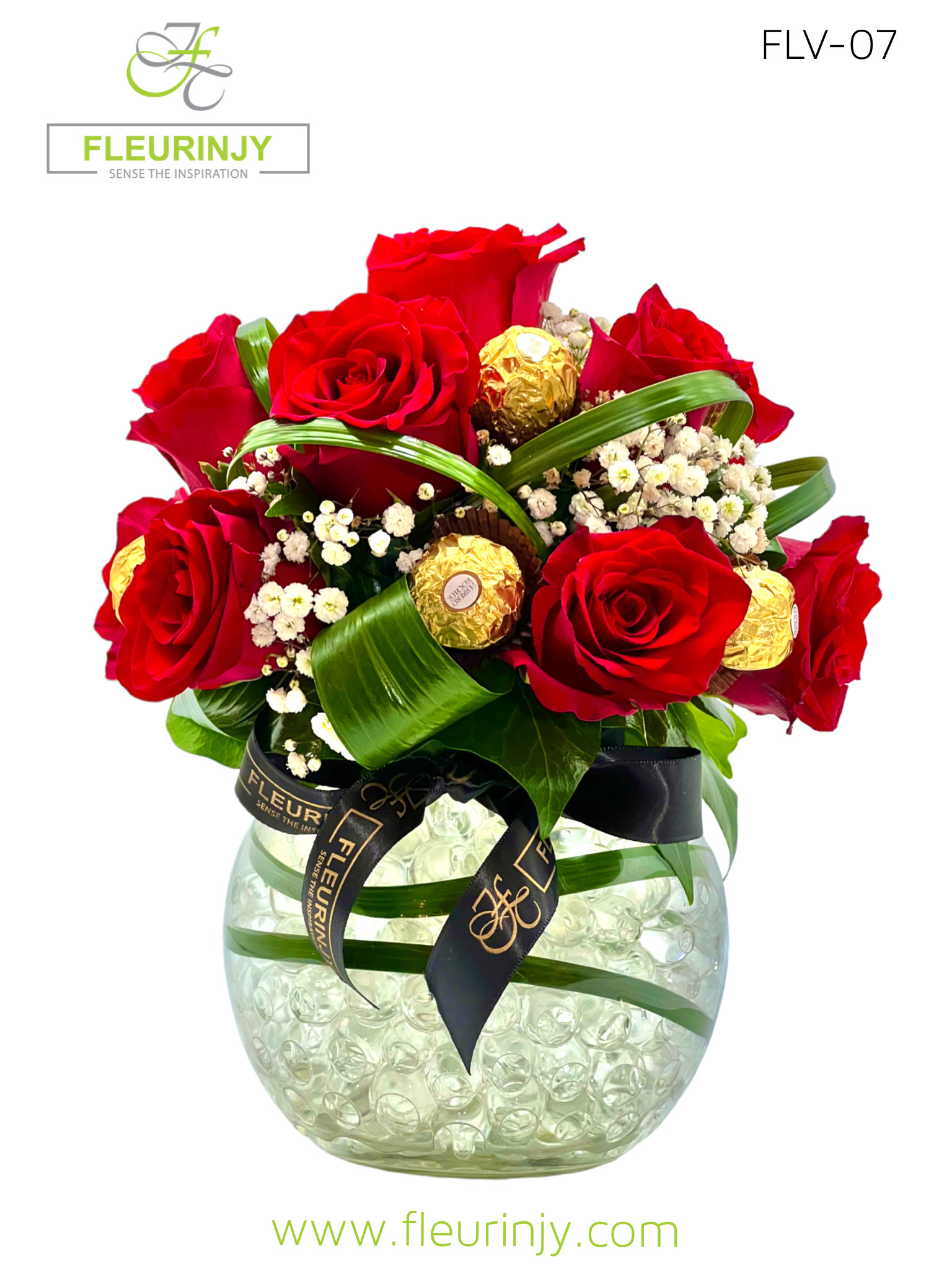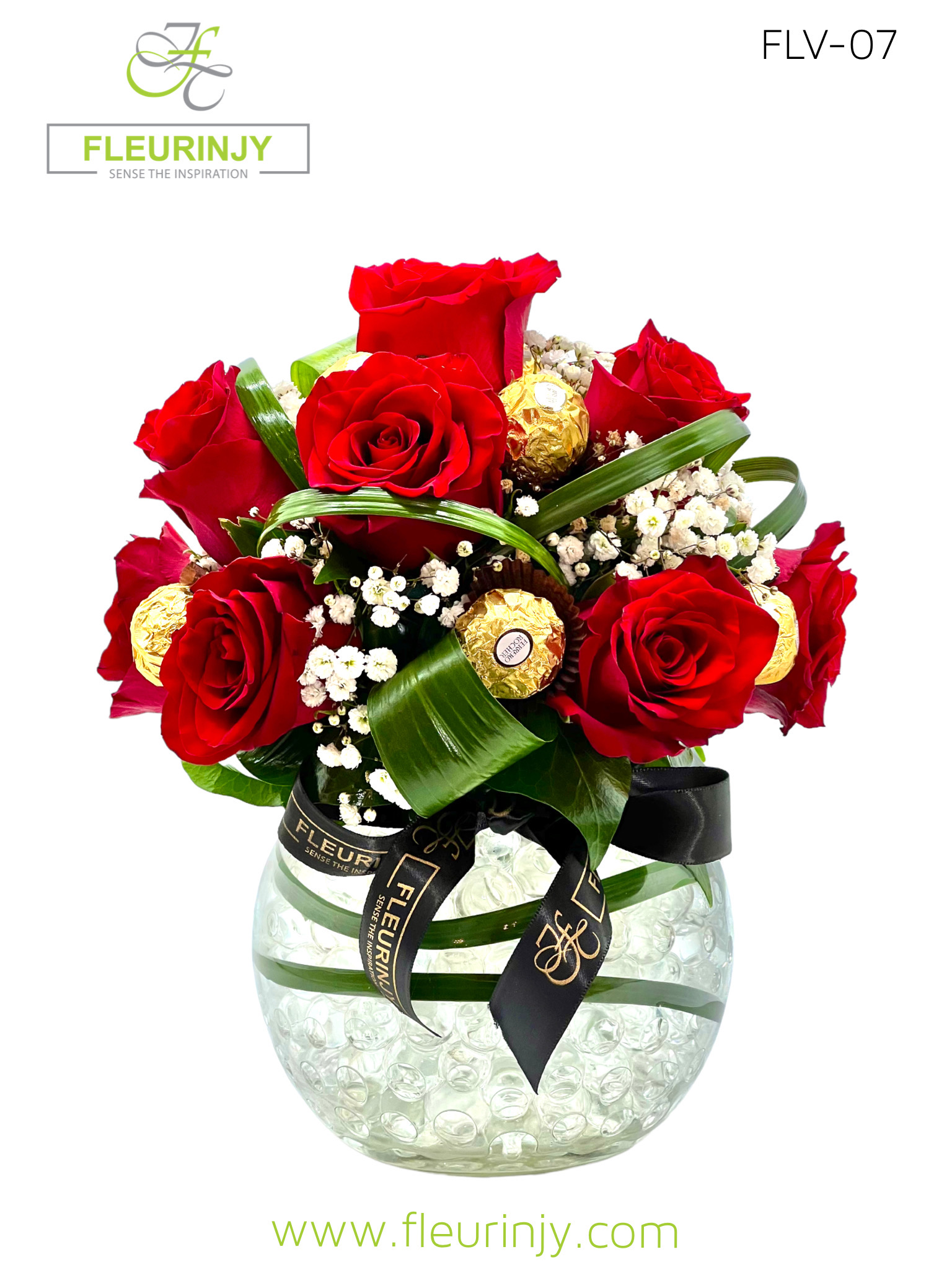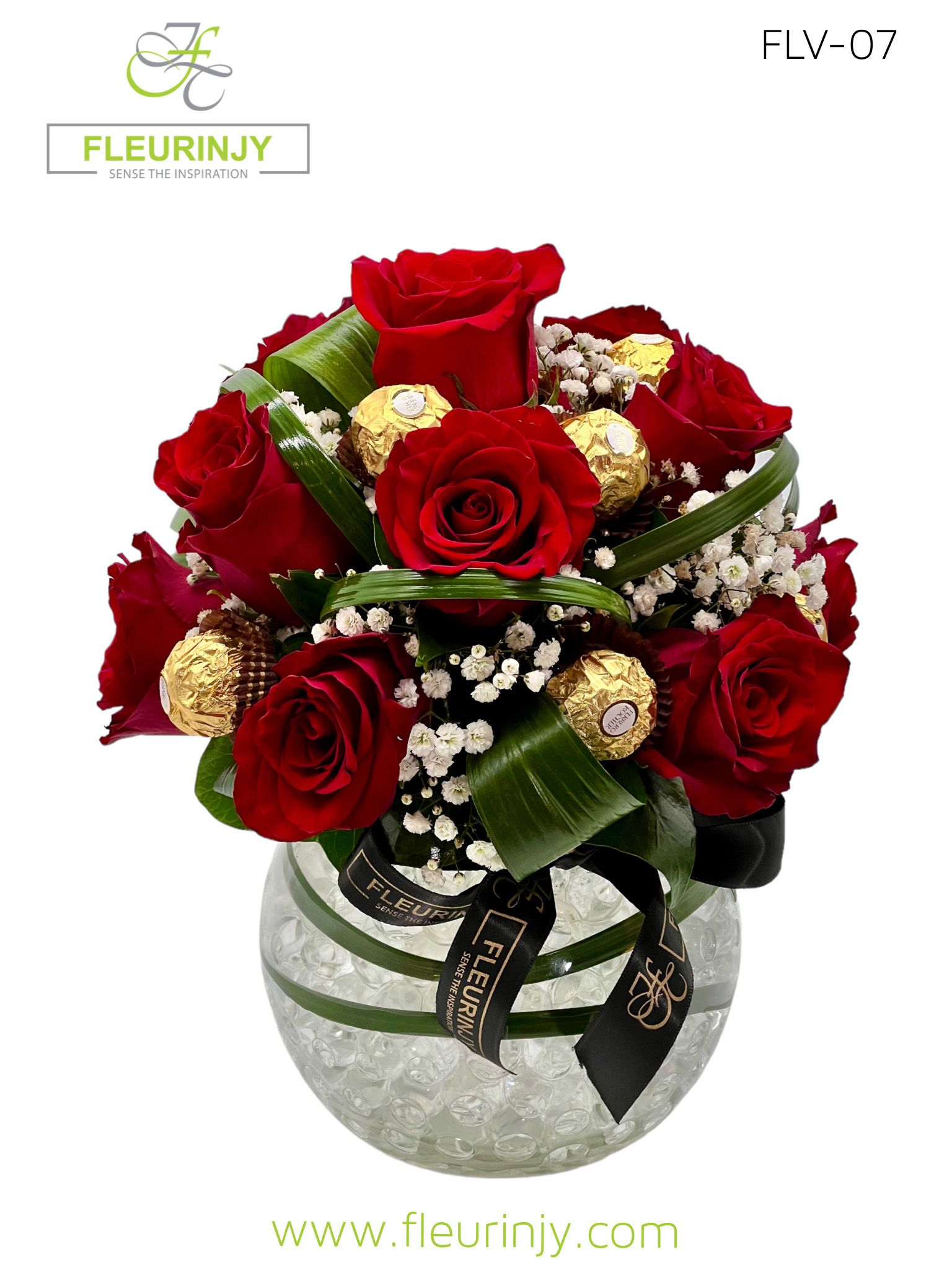 FISH BOWL inside it : Ingredients : 12 red roses, greens, baby breath size: 25 cm Chocolate : 10 rocher