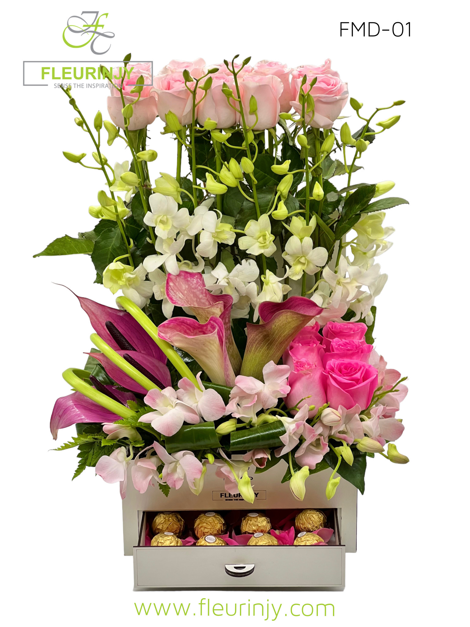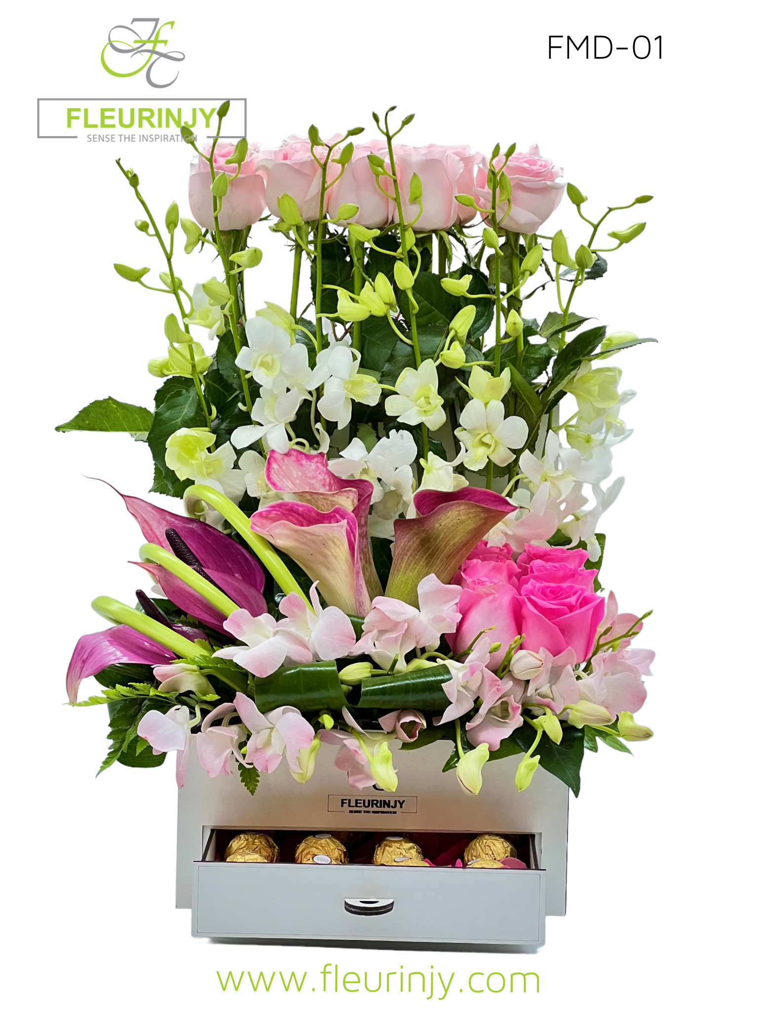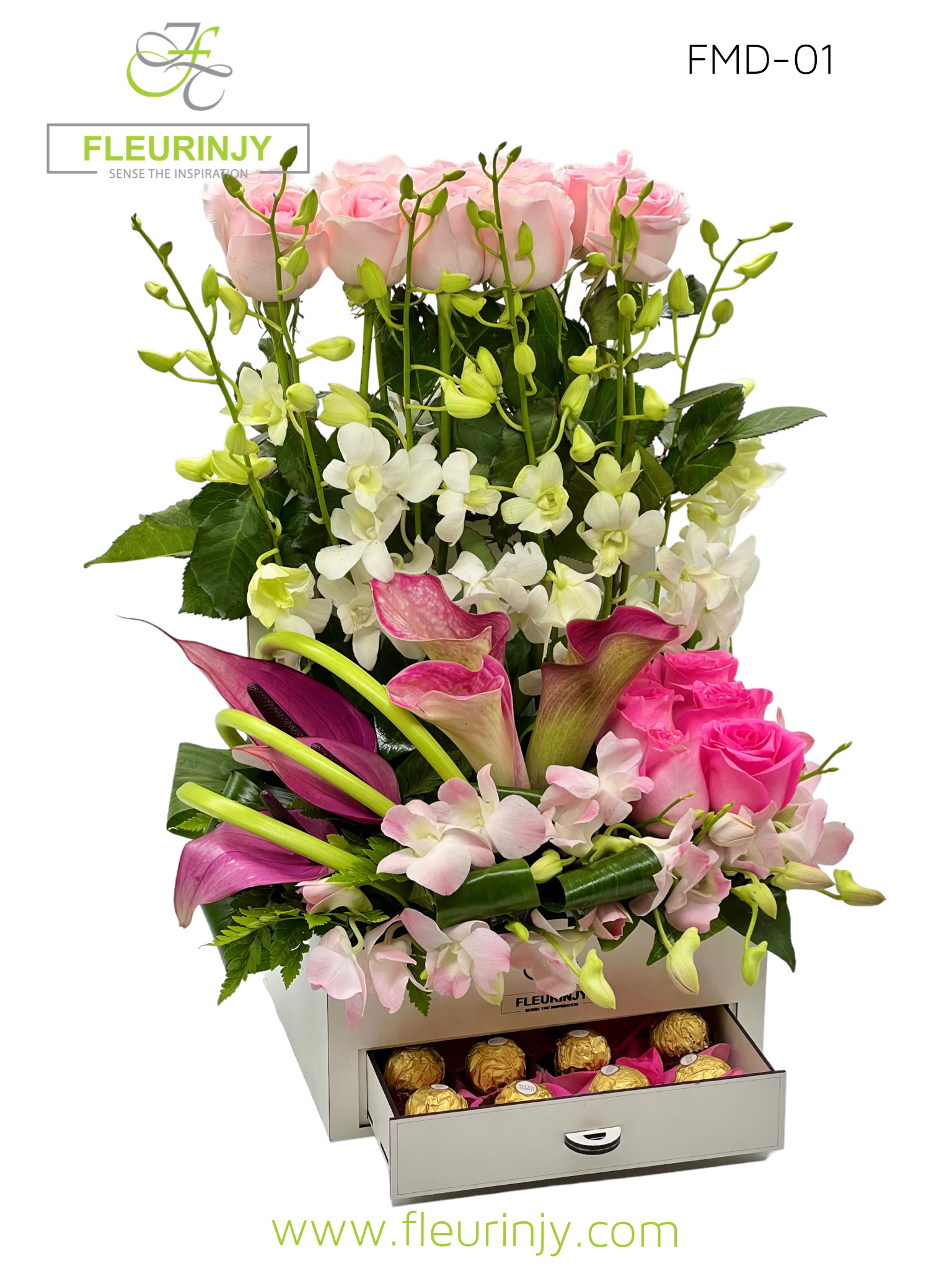 OUR SIGNATURE DRAWER BOX: 7 white baby orchids 3 pink baby orchids 3 purple anthuriums 6 pink roses 3 calla pink 16 pieces rocher SIZE: 45 X 20CM