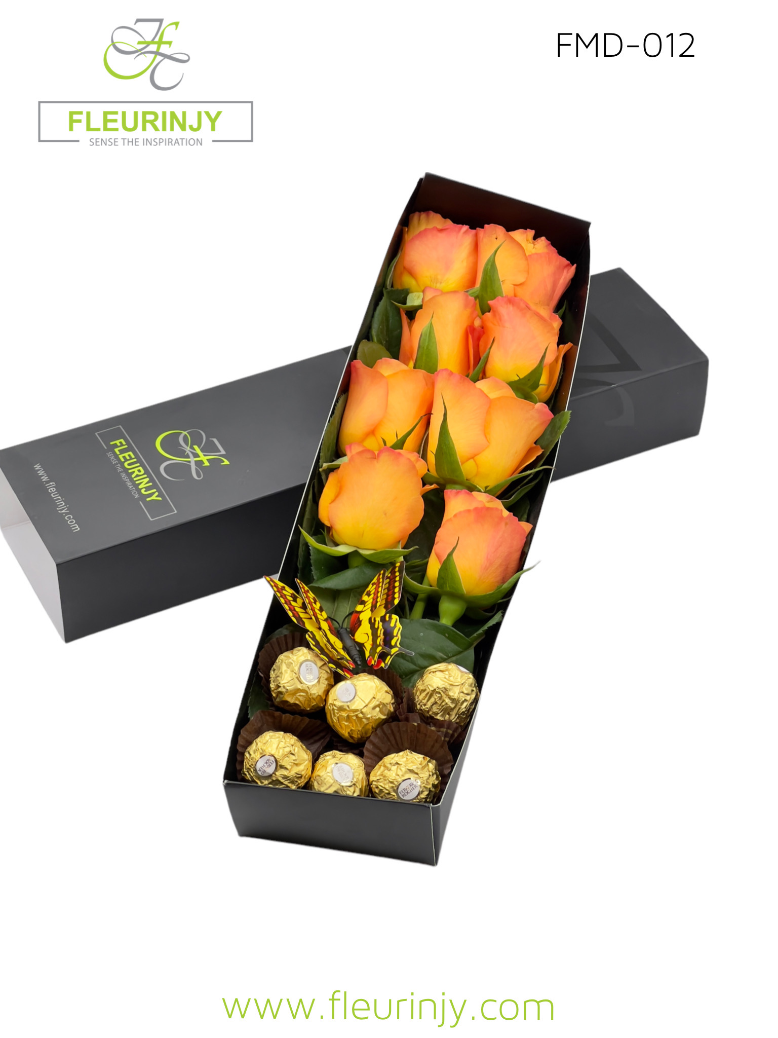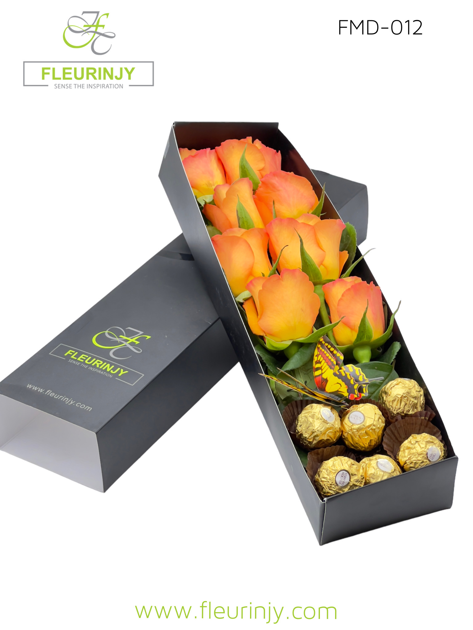 OUR SIGNATURE SLIDING BOX: 8 ORANGE ROSES ORANGE THREADS 1 BUTTERFLY
