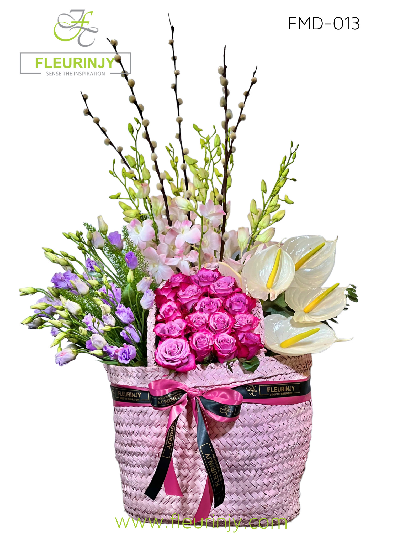 PINK KHOUS BAG: 5 SALIX COTTON 10 PINK BABY ORCHIDS 15 PURPLE ROSES 5 PURPLE STOMA 4 WHITE anthuriums SIZE: 40 X 60 CM