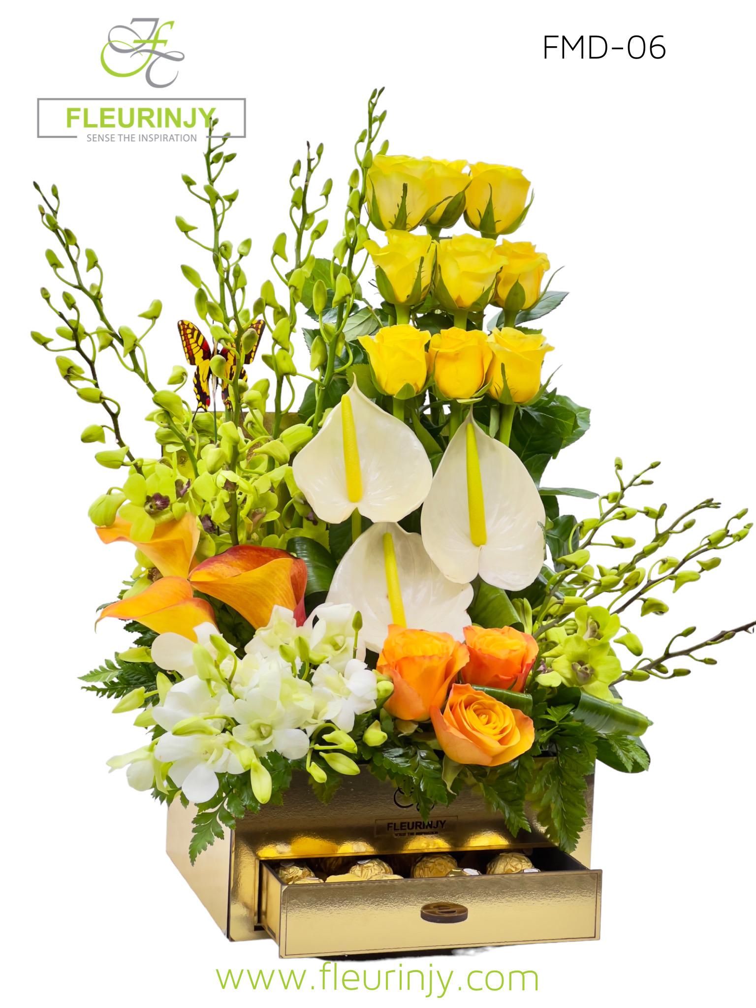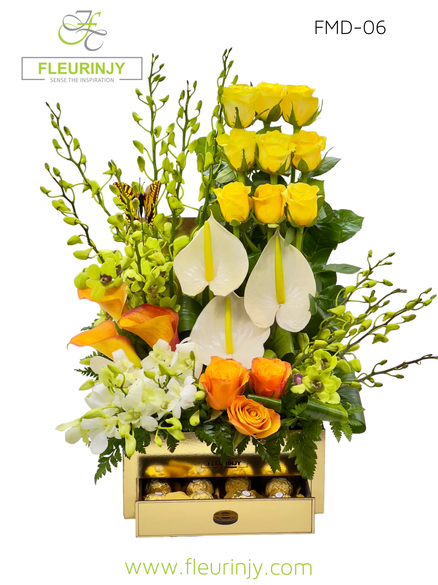 OUR GOLDEN SIGNATURE DRAWER BOX: 10 GREEN BABY ORCHIDS 9 YELLOW ROSES 3 ORANGE CALLA 3 WHITE ANTHURIUMS 3 WHITE BABY ORCHIDS 16 pieces ROCHER SIZE: 20 X 50 CM