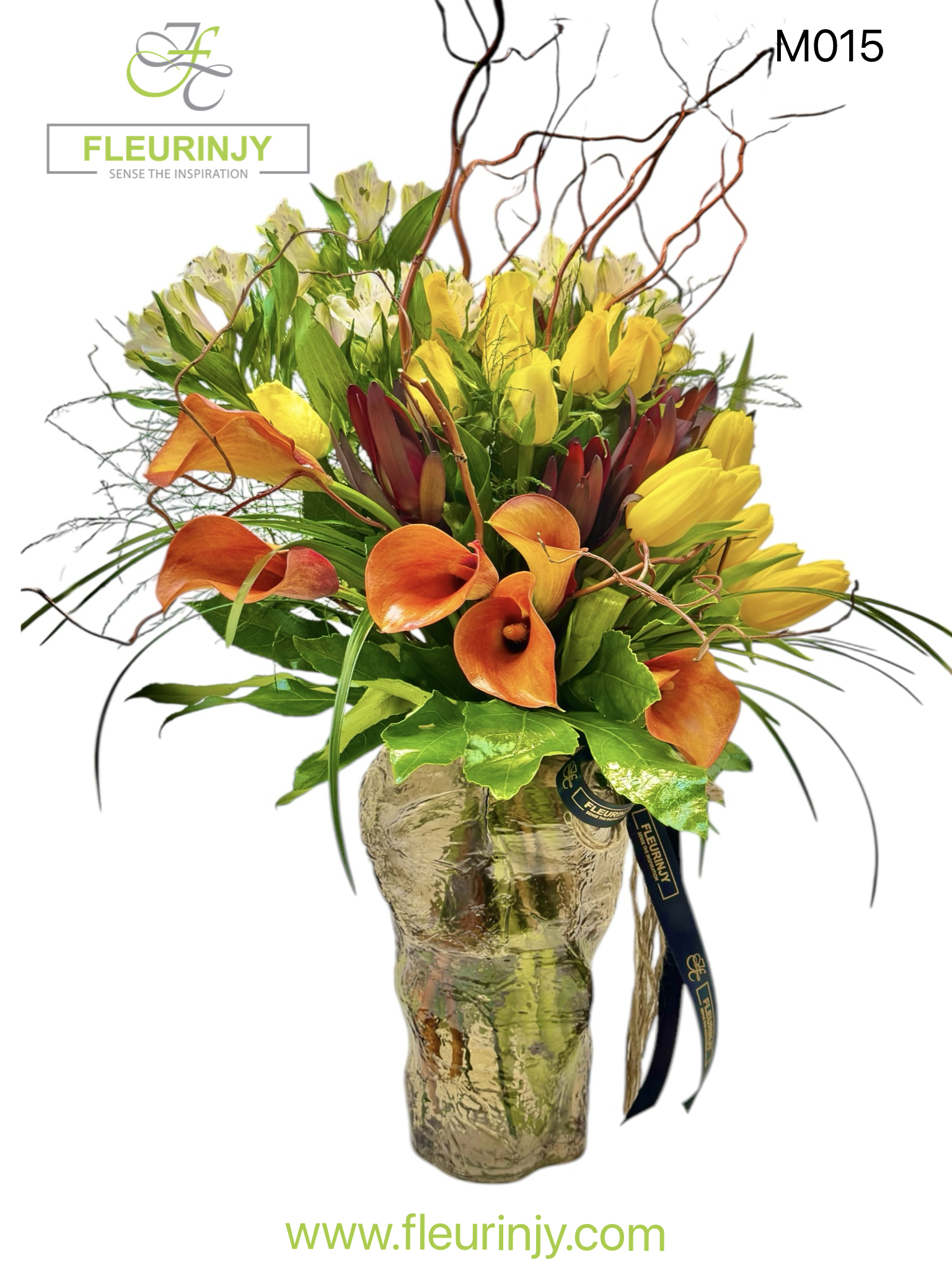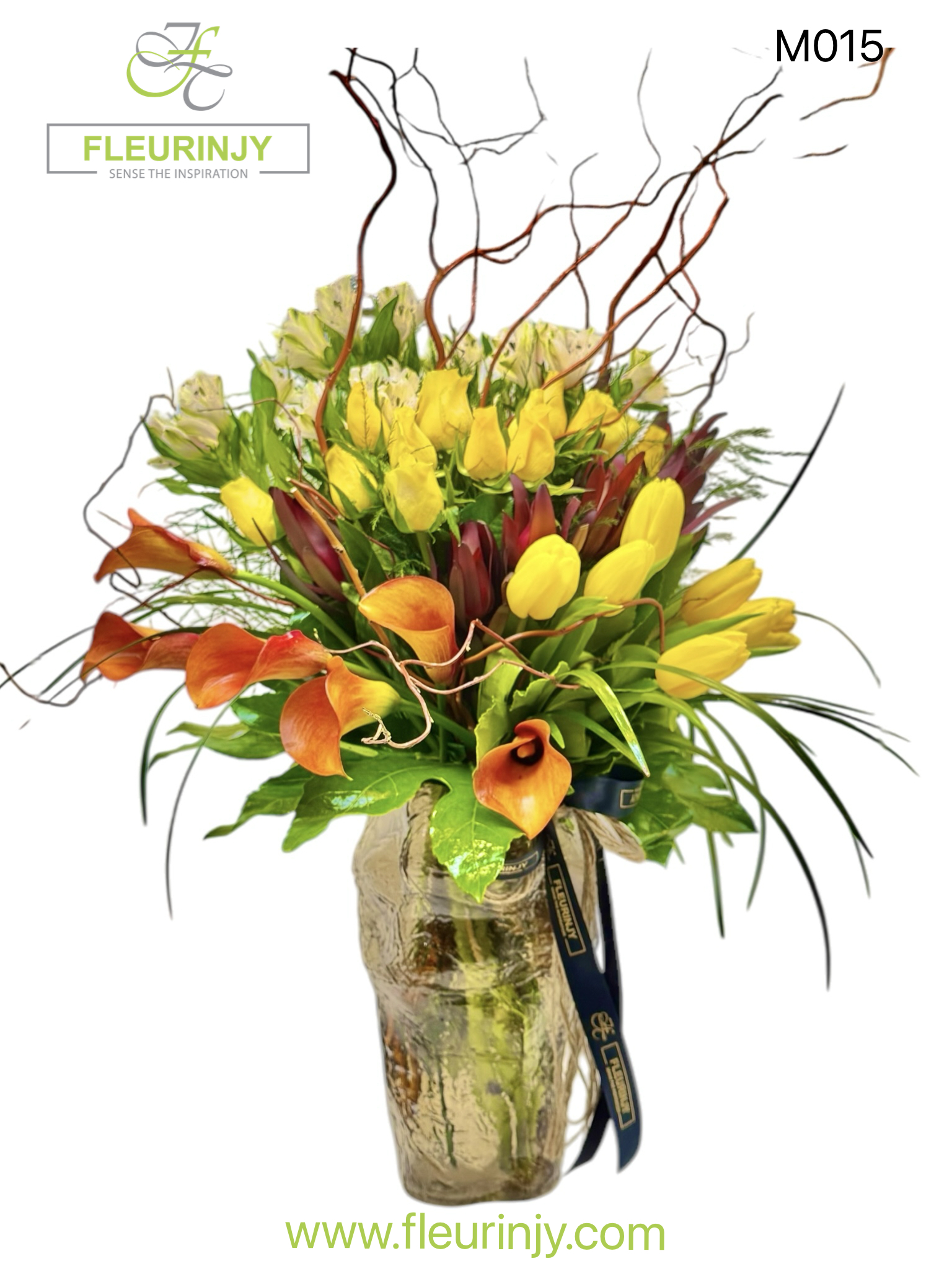 THE ROCK VASE 7 TULIPS 6 CALLA 12 ROSES 7 ALSTROEMERIAS 7 SAFARI 5 SALIX CURLS GREENS SIZE: 90 X 50 CM