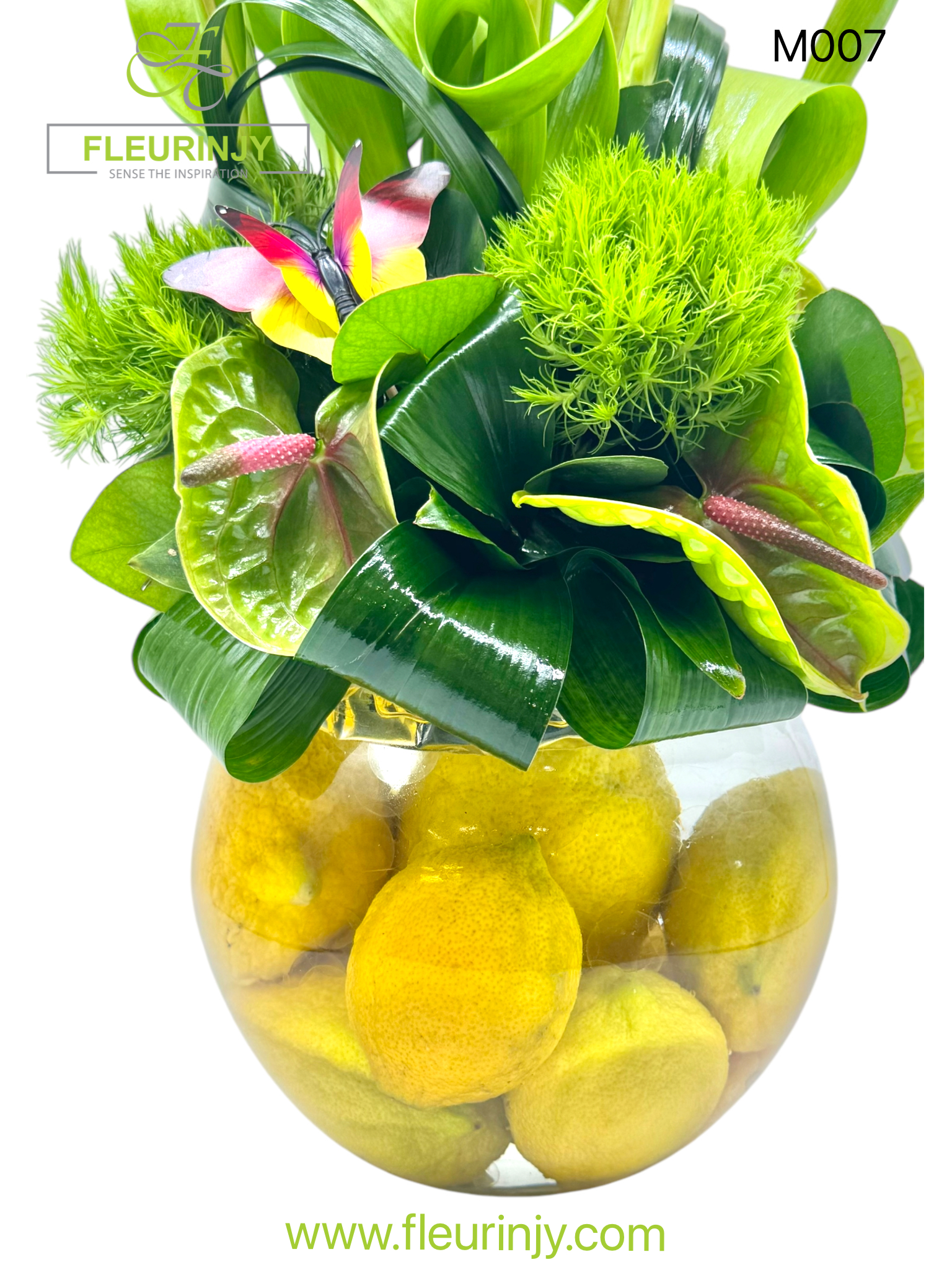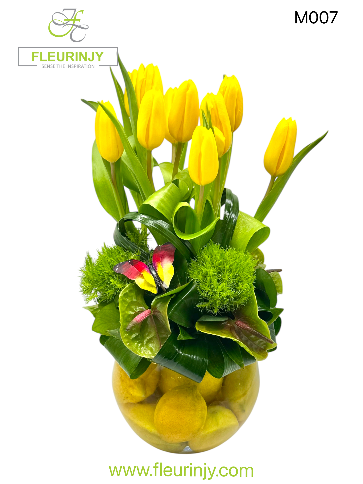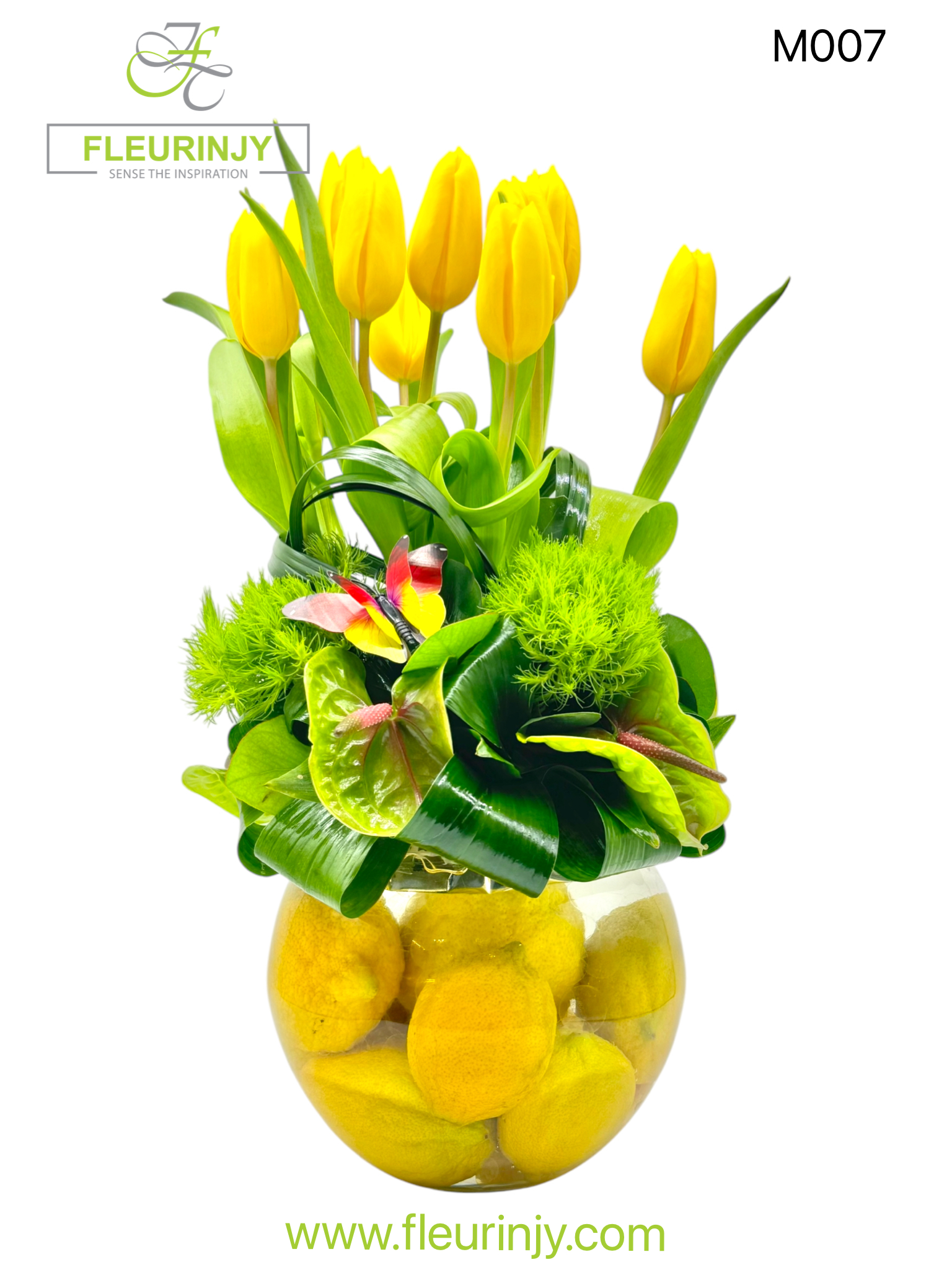 THE ZESTY LEMON VASE 10 TULIPS 4 ANTHURIUMS 3 SWEET WILLIAMS GREENS SIZE: 43 X 26 CM