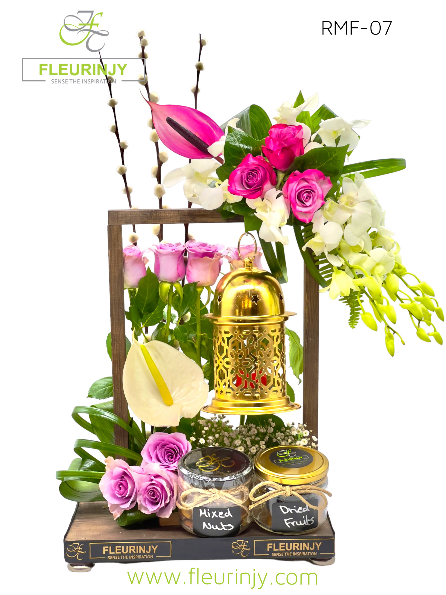 Wooden pallet 10 purple roses 4 white orchids 3 salix cotton 1 white anthurium 1 golden lantern 1 dried fruits jar 1 mixed nuts jar SIZE : 30 X 60 CM