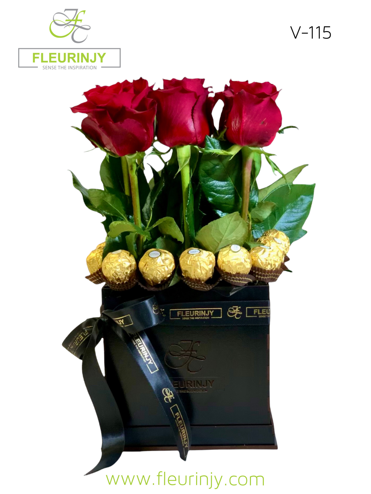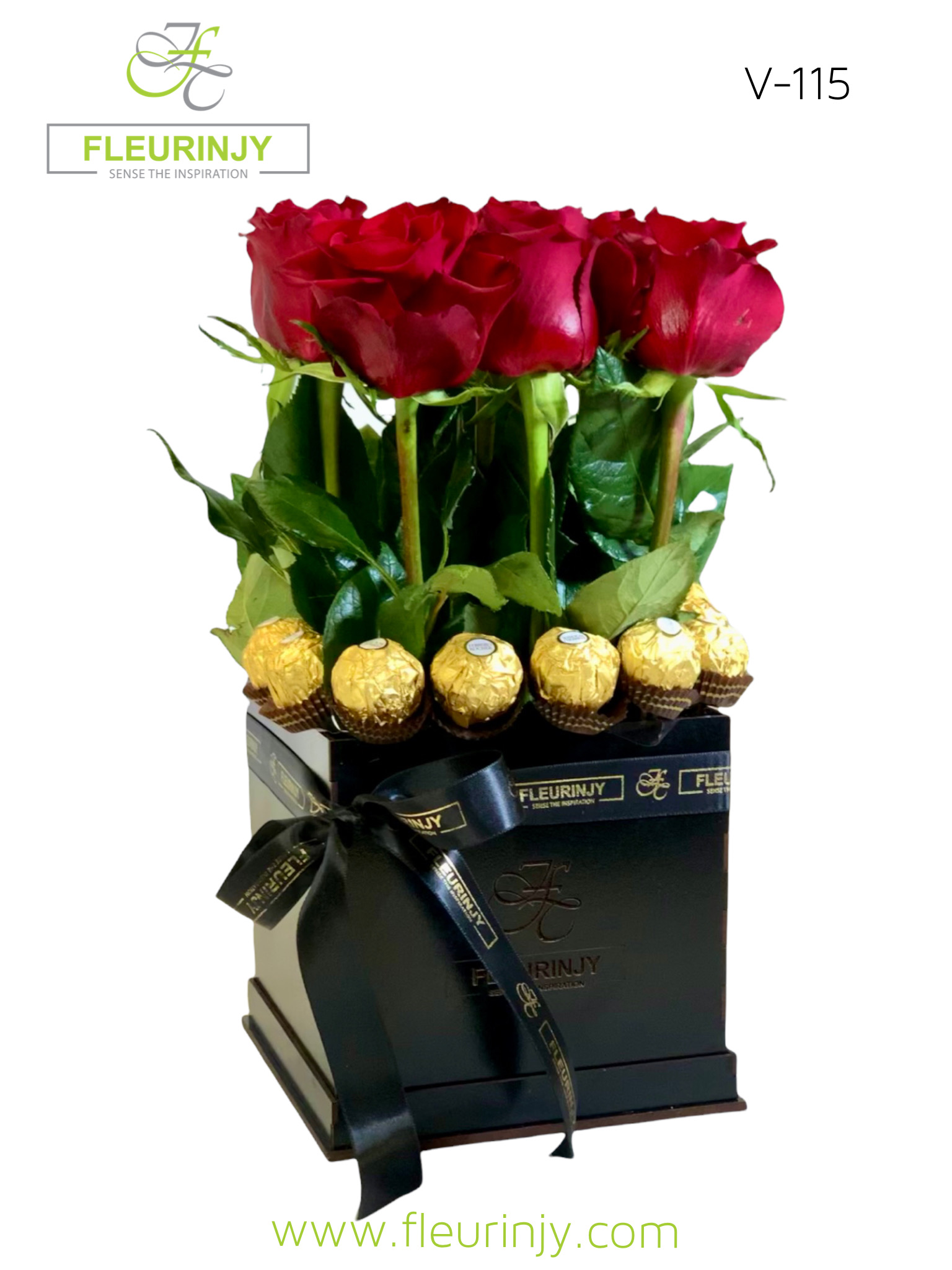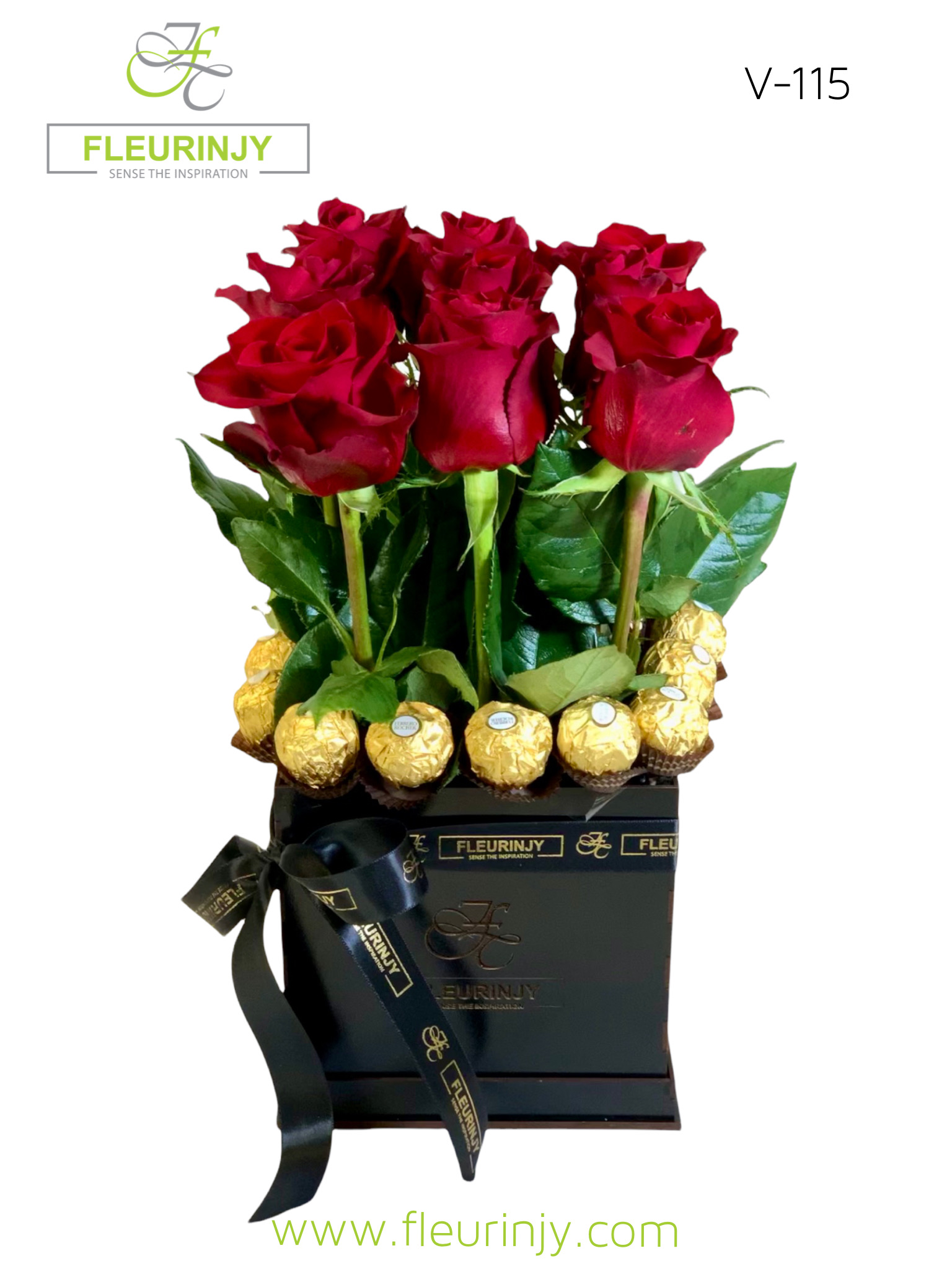 Description OUR SIGNATURE SQUARE BOX. SIZE: 40 X 20. 9 RED ROSES. 8 ROCHER CHOCOLATE.