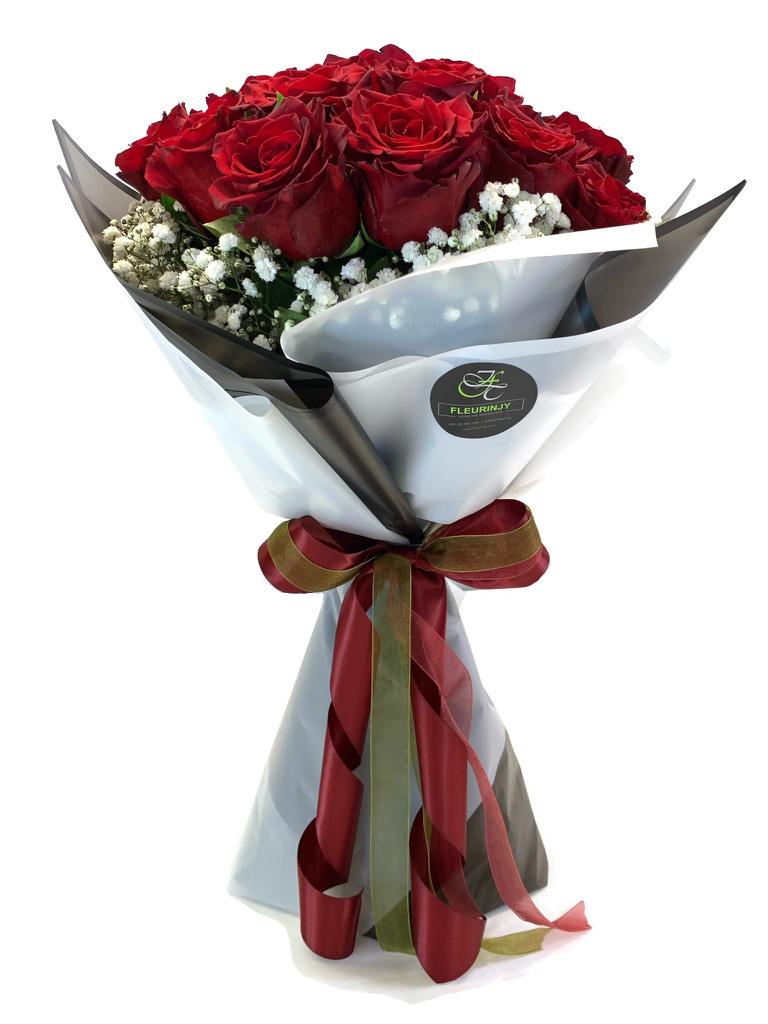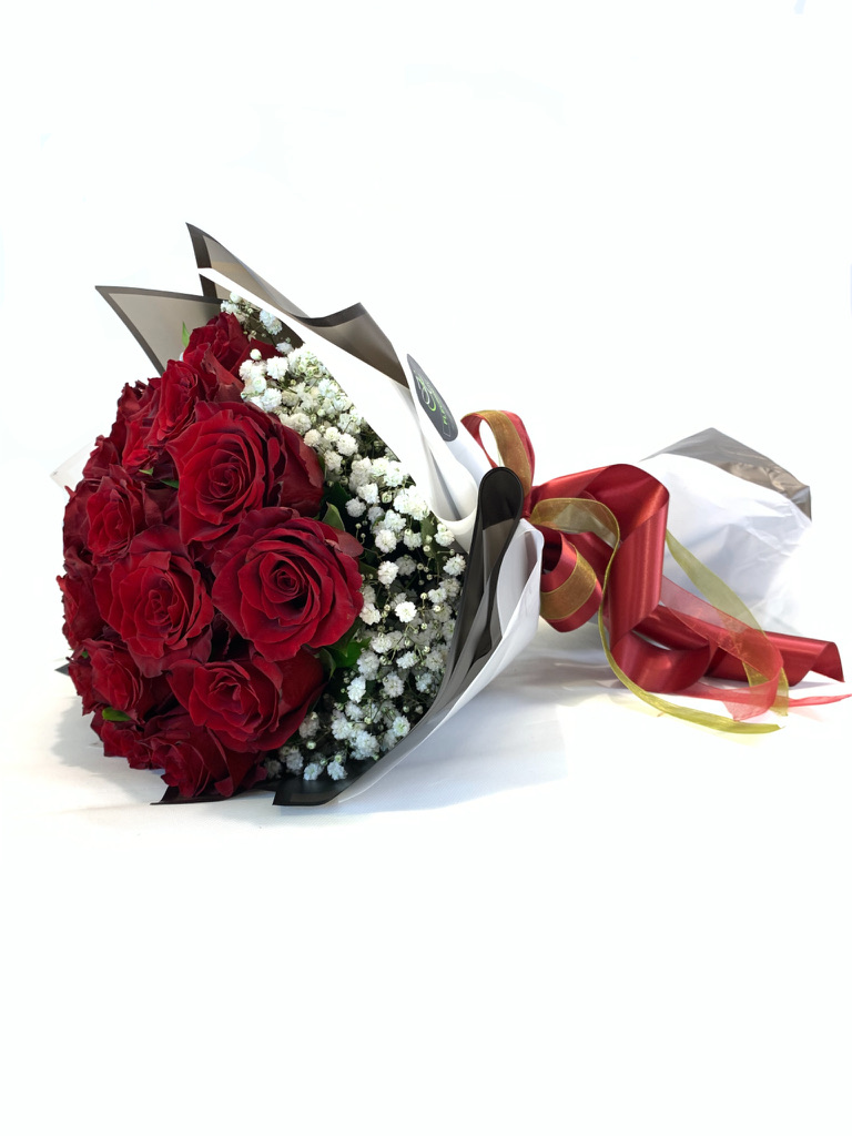 Description: Hand Tied Bouquet Wrapped In our Special Paper 24 Red Roses Height: 60 Cm Baby Breath