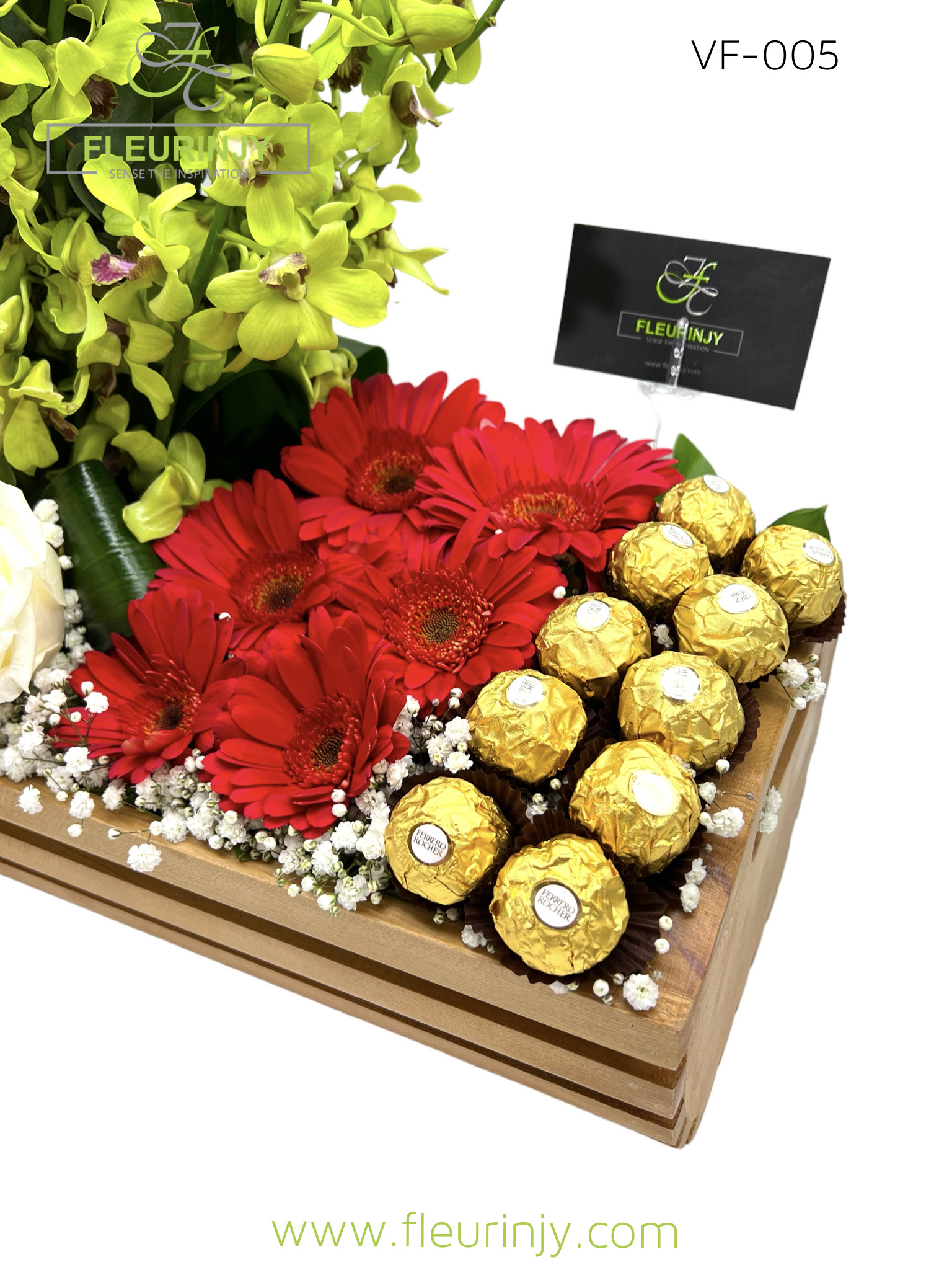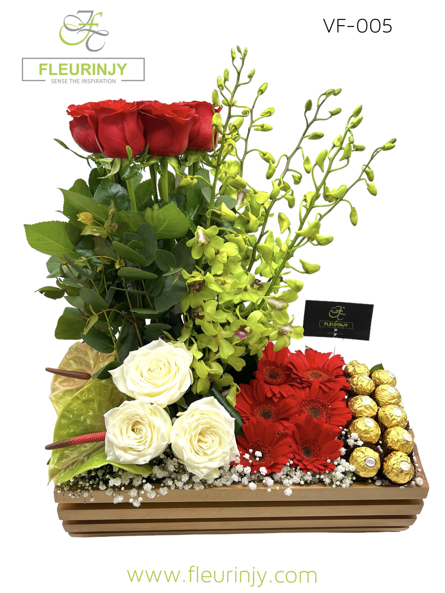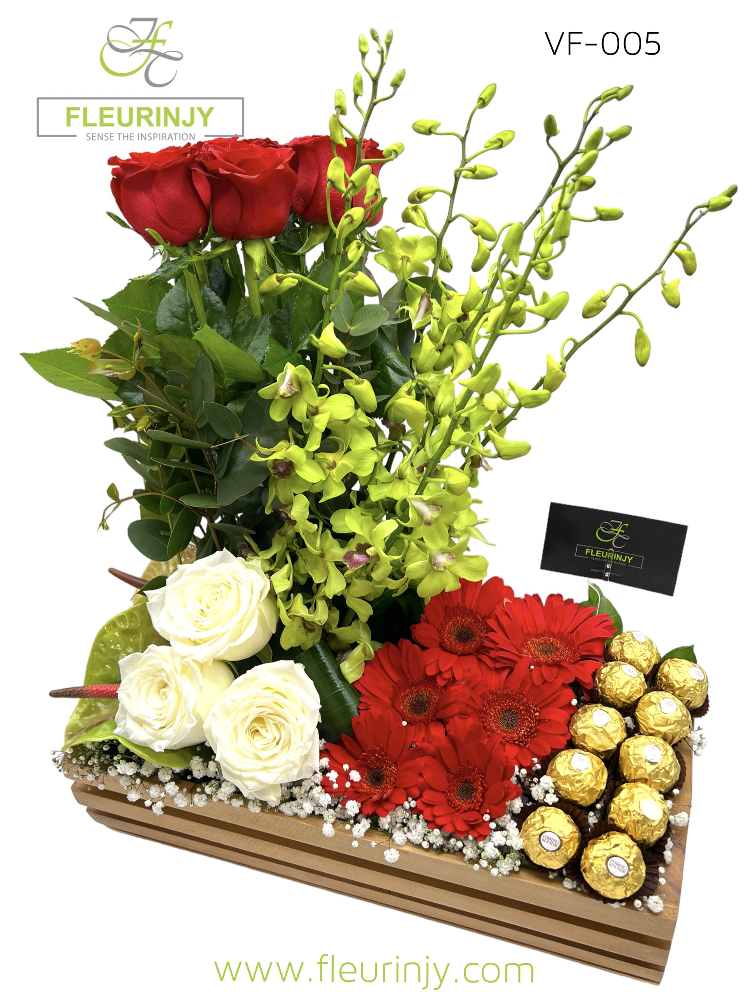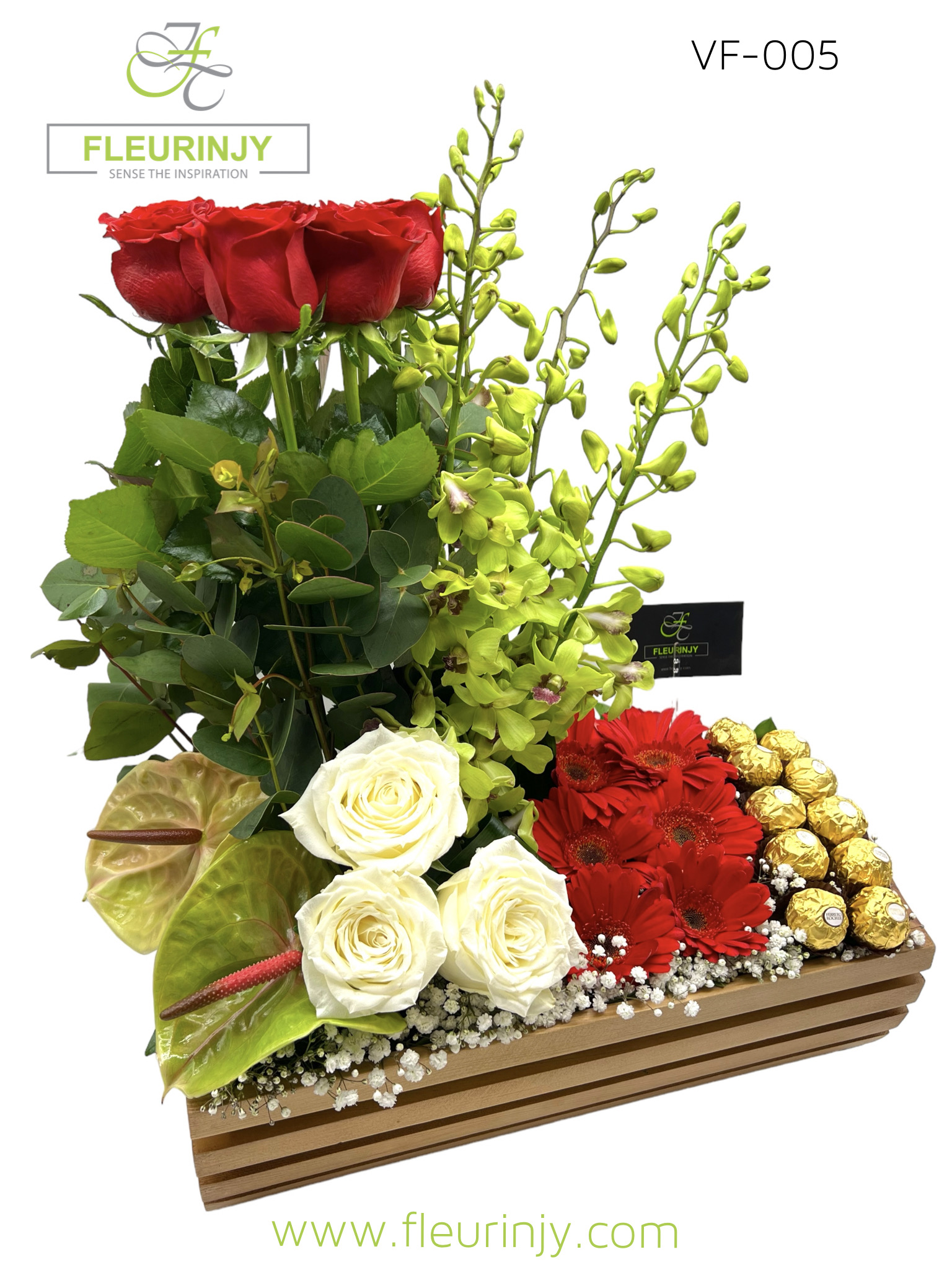 WOODEN BASKET 10 RED ROSES 5 GREEN BABY ORCHIDS 6 RED GERBERAS 3 WHITE ROSES 2 GREEN ANTHURIUMS 10 ROCHER CHOCOLATES MIX OF GREENS