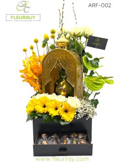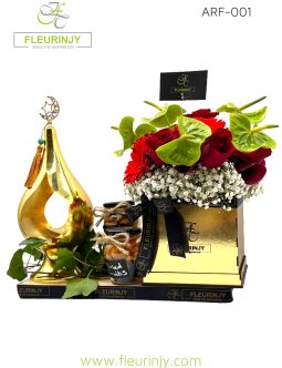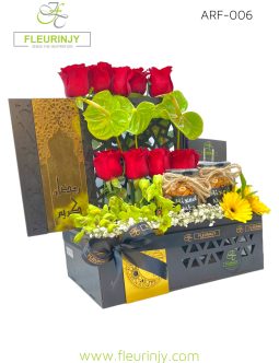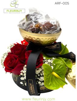 Flat Box: 1 Tamreya made of opaque stainless steel 3 Roses 2 Anthurium 3 Gerbera Inside the Tamreya: Quarter kilo of Premium Mejdool Dates From Timar, Stuffed with: -Caramalized Almonds – Pistachio oriental flavor – walnut Caramel – Halawamania – Hazelnut Croquant Chocolate Dates