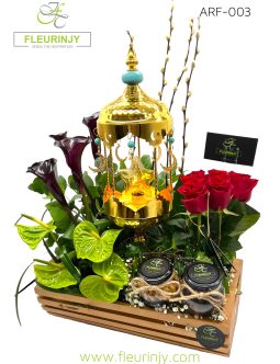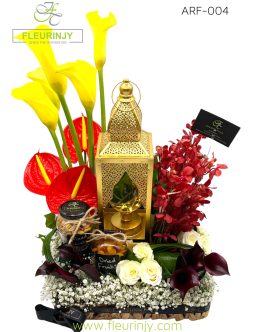 Square Basket: 1 Stainless steel fanous 11 Calla 6 Roses 7 Baby orchids 3 Anthurium 1 jar dried fruits 200 grms 1 jar mixed nuts 150 grms Size: 34 x 55