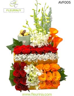 2 LEVEL WOODEN BOX 1 MUG INSIDE IT 5 CHOCOLATE ROCHER 20 RED ROSES 8 baby orchid 3 callas 9 ORANGE ROSES GREENS