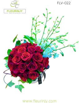 Khoose Basket inside it: 8 black callas 8 white baby orchids 3 red anthuriums 20 red roses greens Size: 70 x 40